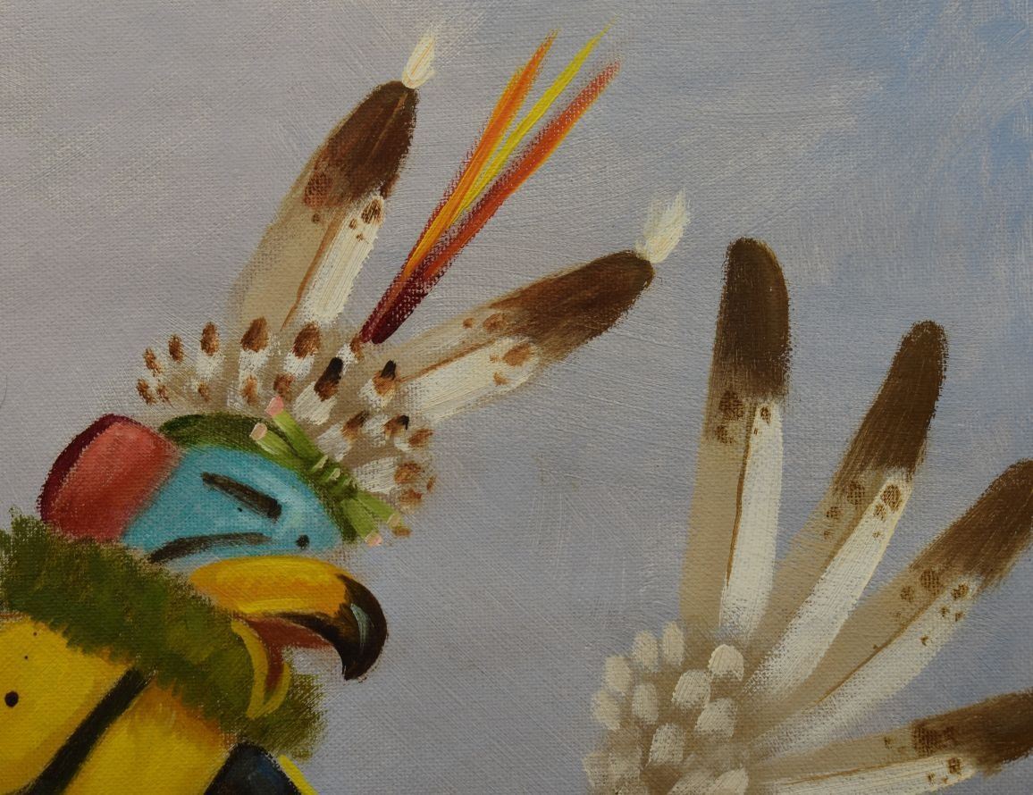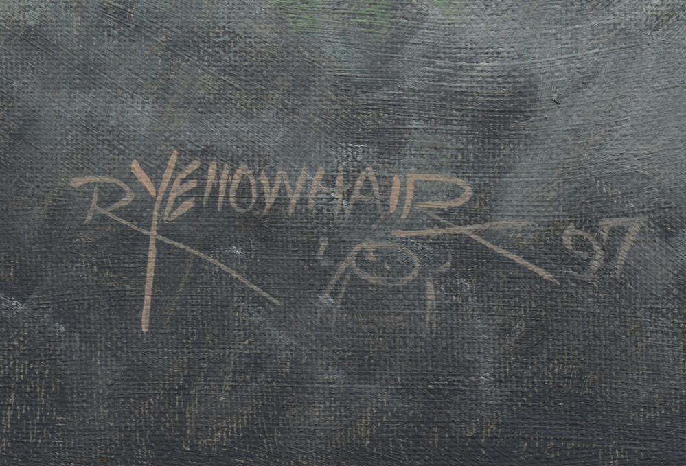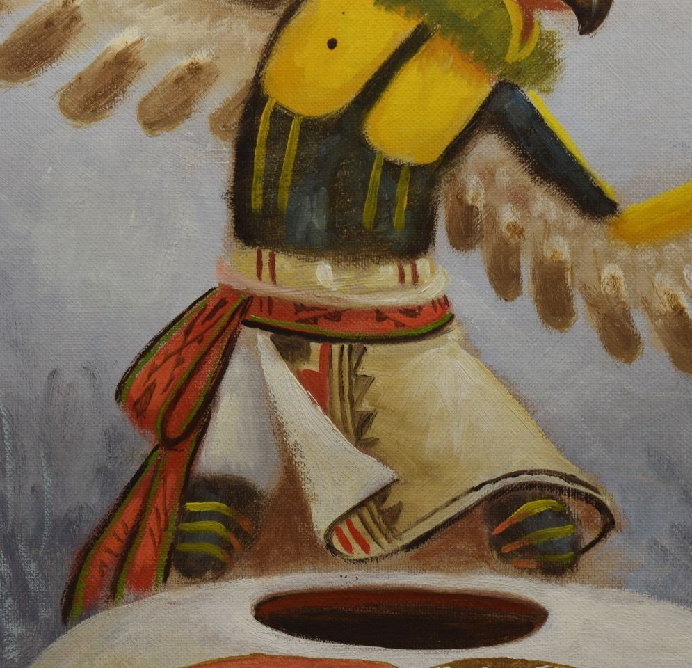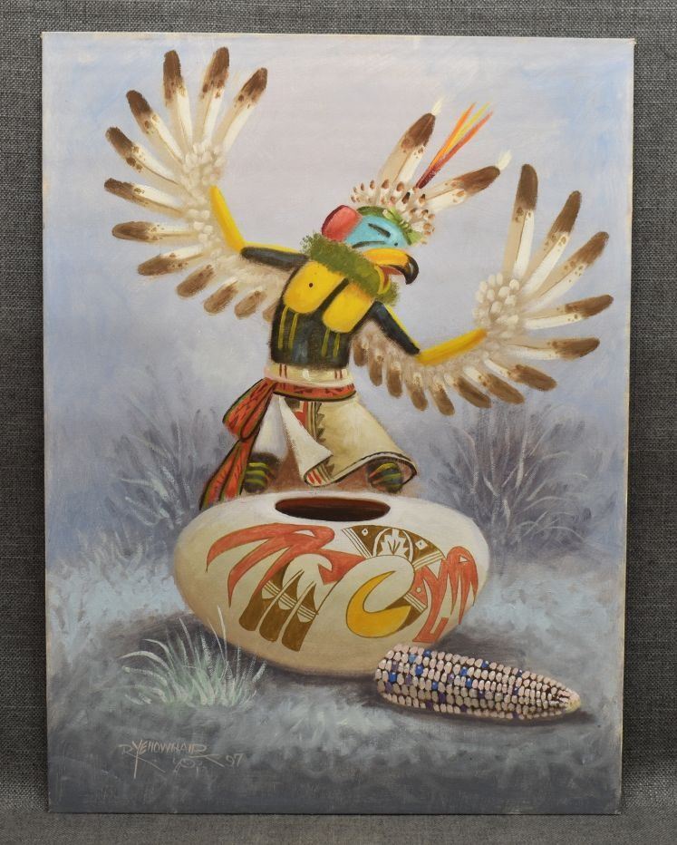 1997 Navajo Indian, hand painted on canvas board depicting eagle dancer and pot signed R Yellowhair 18" x 24"