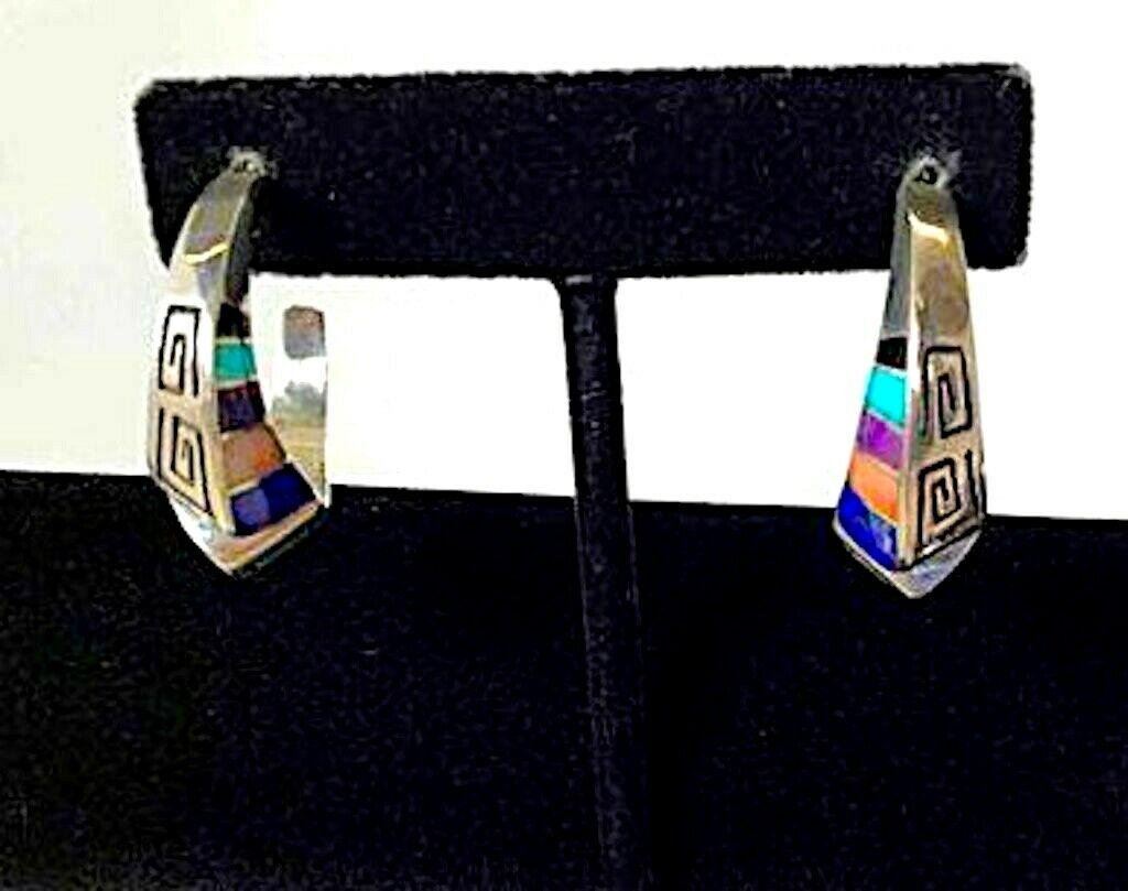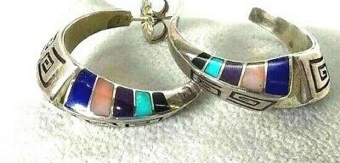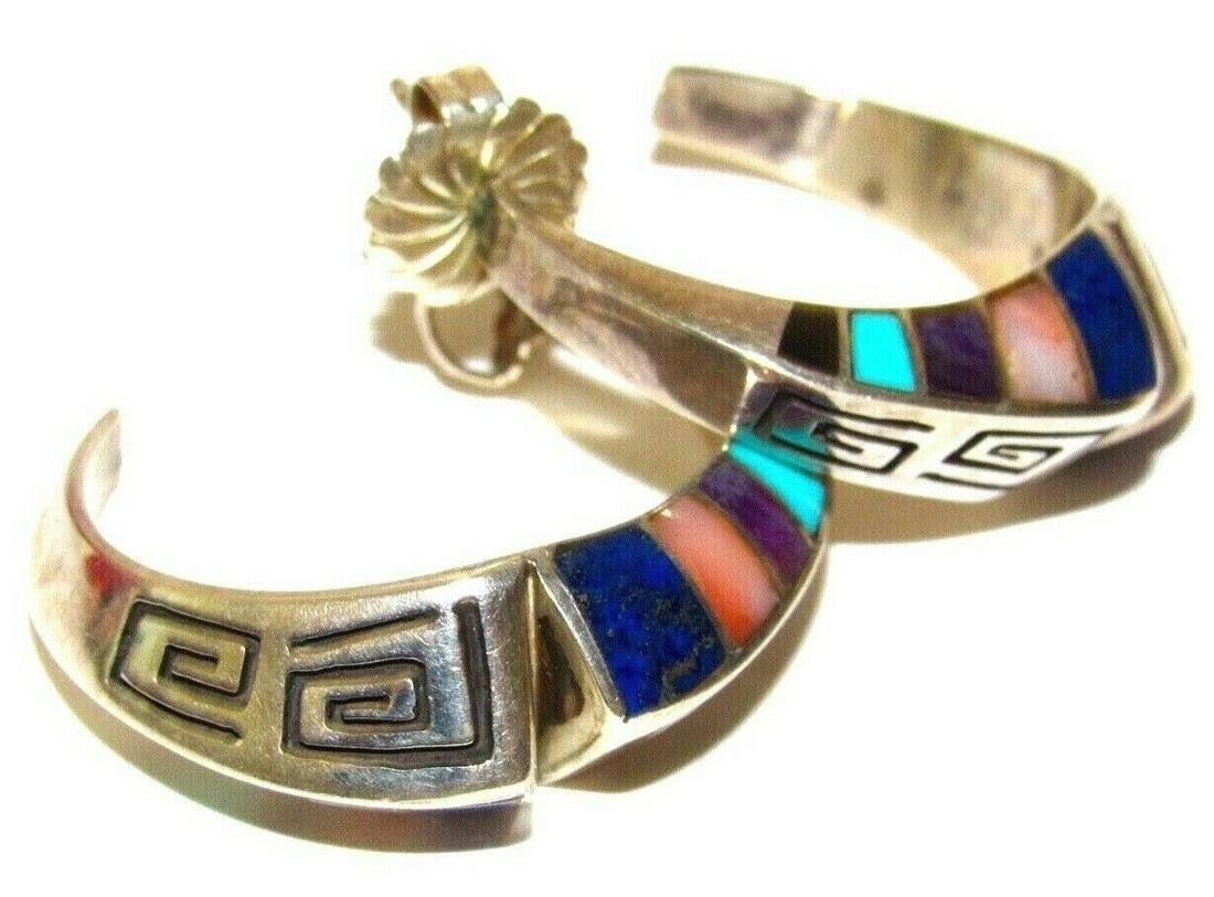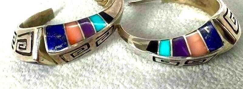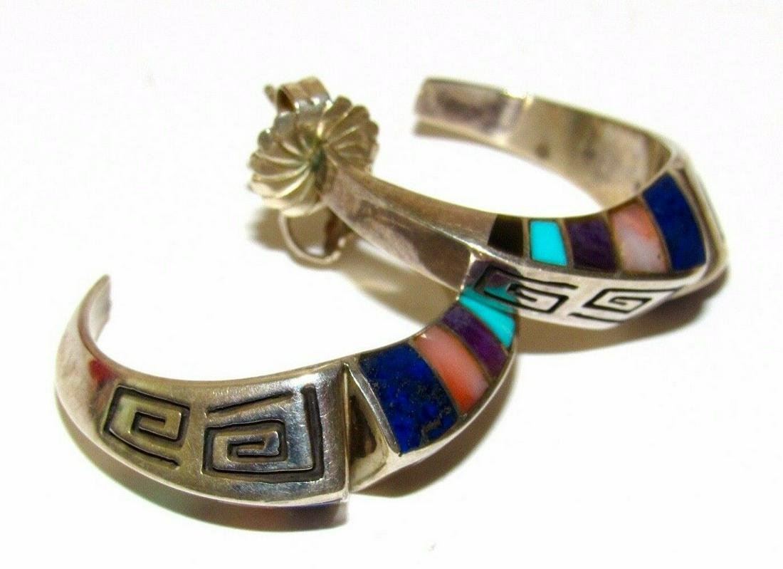 Phenomenal, Native American Navajo sterling silver intricately hand etched multi stone inlay statement hoop earrings by the highly collectible, award winning Navajo artist Lonn Parker. Exceptional craftsmanship and attention to detail, intricately hand etched symbols on both sides, inlaid with turquoise, coral, lapis, and sugilite. Stone inlay is on both sides. Famous Lonn's horse hoof shape design. The hoops measure about 1". Stamped sterling, signed by the artist. Exceptional example of wearable Native American art to add to any jewelry collection.