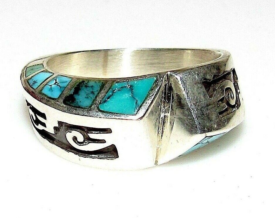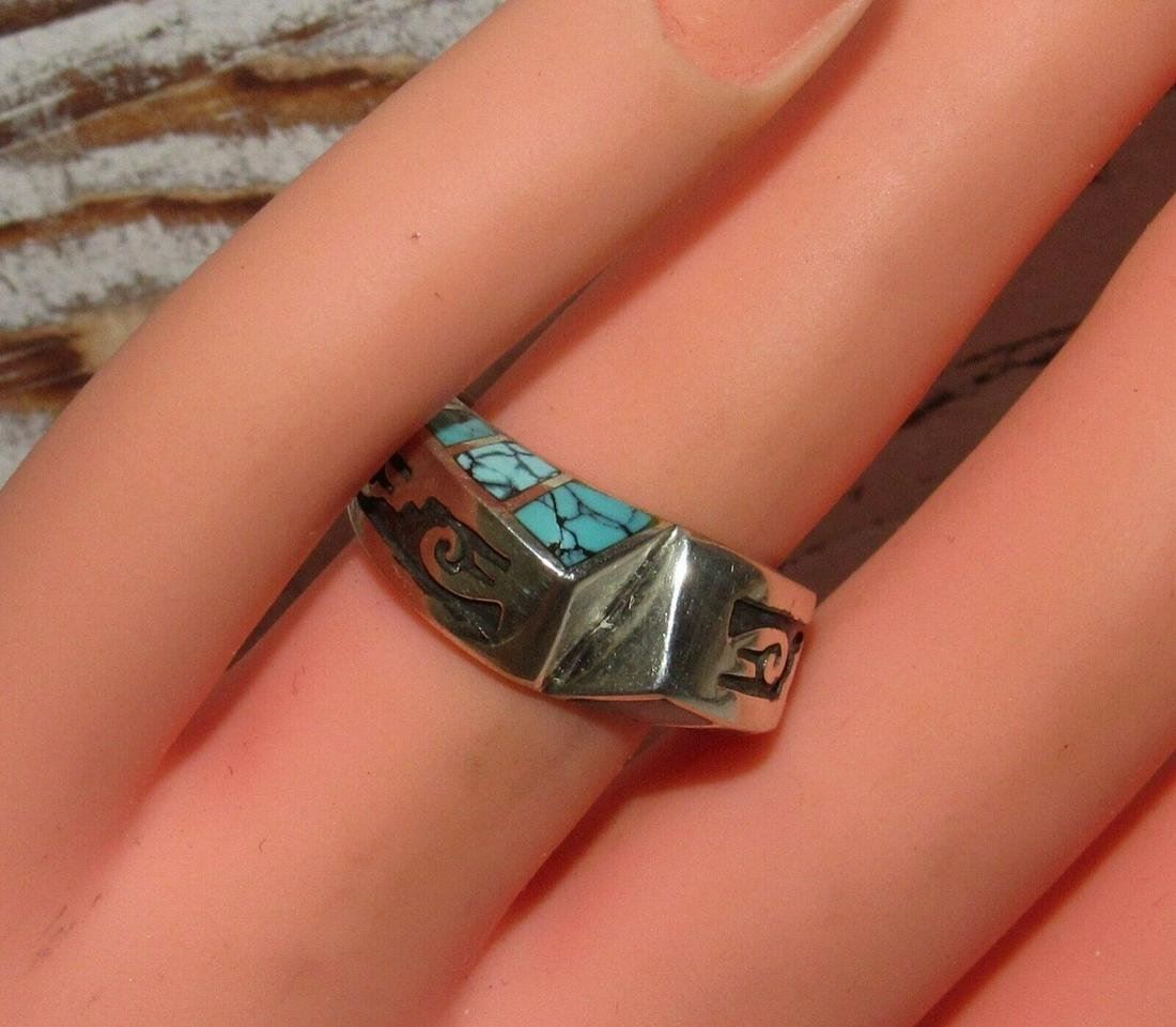 Phenomenal, Native American Navajo sterling silver intricately hand etched turquoise inlay statement ring by the highly collectible, award winning Navajo artist Lonn Parker. Exceptional craftsmanship and attention to detail, intricately hand etched water symbols on both sides, inlaid with turquoise. Stone inlay is on both sides. Famous Lonn's horse hoof shape design. The ring is size 7. Comes from the artist's collection. Stamped sterling, signed by the artist. Exceptional example of wearable Native American art to add to any jewelry collection.
