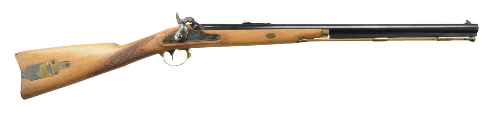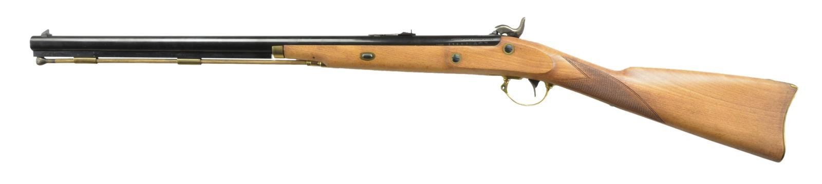 Cal. 58. S# 19850 (1970). Mfg. in Italy. Bbl. 25 1/2" w/ blade front sight & adj. rear sight. Blue finish bbl. Case colored lock & hammer. Tan colored hardwood stock w/ brass accents including patch box. Hardwood brass tipped ramrod held on under rib by 2 pipes. UNATTACHED ACCESSORIES: Navy Arms Antonio Zoli smoothbore 25 1/2" bbl. w/out sights, nipple. Good overall condition w/ wear & oxidation. CONDITION: Very good metal finish. Very good stock finish. Brass tip, patch box & buttplate have areas of verdigris & heavy oxidation. Very good bore. (01-20873/MD). ANTIQUE. $200-500.