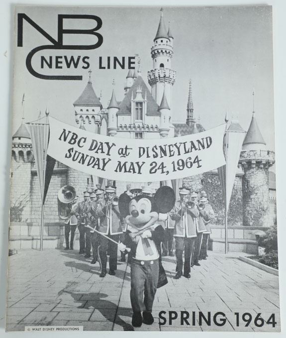 (NBC News Line Magazine, c. 1964). A rare, vintage "NBC News Line" magazine with cover story on Disneyland and NBC Day at the park on May 24, 1964. The cover shows Mickey Mouse leading the Disneyland Marching Band across the Sleeping Beauty Castle bridge. The magazine is in good condition with normal wear from age and use.