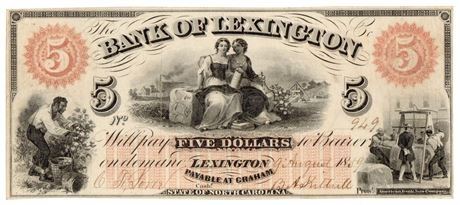 NC. 1859 $5 Bank of Lexington Obsolete Bank Note