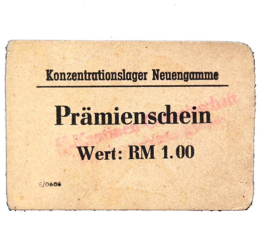 Konzentrationslager Neuengamme / Prmienschein / Wert: RM 1.00 on cream card, SS-Kantinen-Gemeinschaft / Hamburg-Neuengamme magenta handstamp, measures approx 70 by 48/50mm, light soiling, VF.