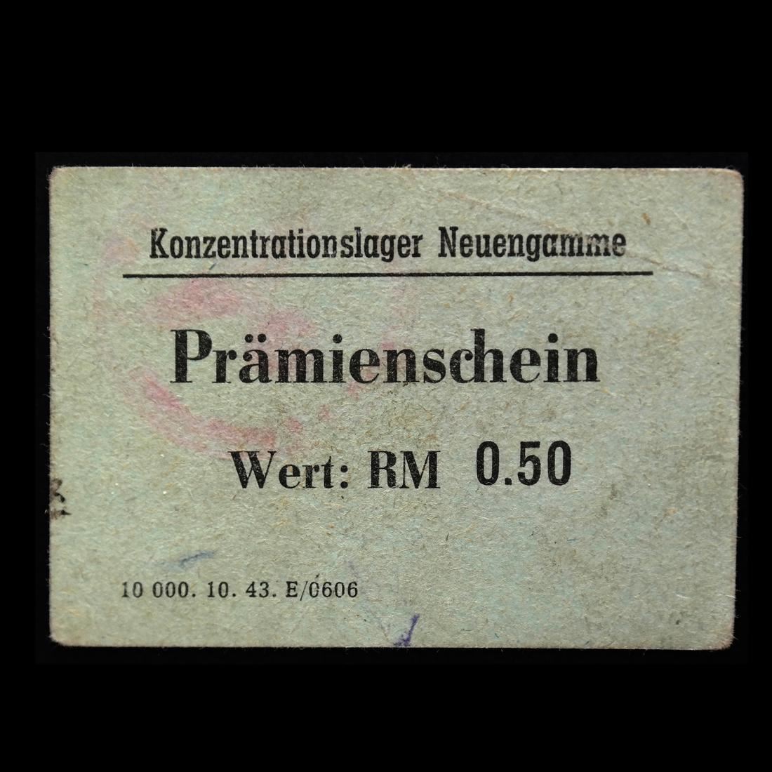Konzentrationslager Neuengamme / Prmienschein / Wert: RM 0.50 on grayish blue card, magenta control handstamp, measures approx 70 by 49mm, light crease and ink marks, VF.