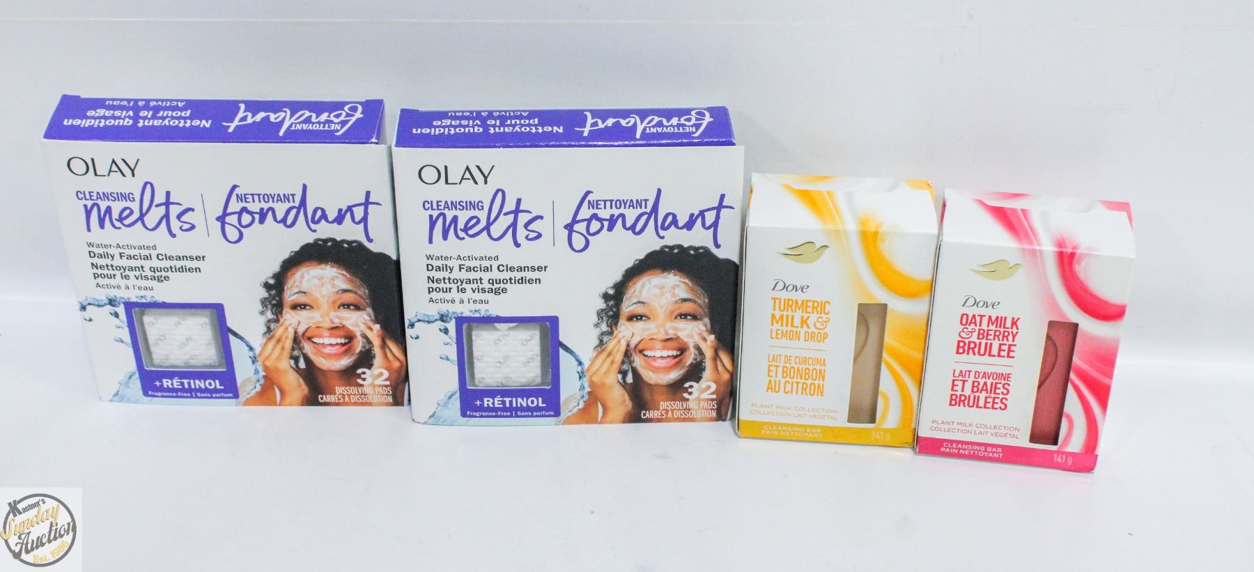 BAR SOAP OATMILK & BERRY BRULEE & TURMERIC MILK & LEMON DROP W/SEALED 2 OLAY CLEANSING MELTS FACIAL RETINOL PADS 32 EACH BOX **ALL ITEMS MUST BE REMOVED BY 5PM SATURDAY, JANUARY 17TH 2026. ALL REMAINING ITEMS WILL BE SUBJECT TO A $6.00 PER DAY STORAGE CHARGE. ANY ITEMS REMAINING AFTER MONDAY, FEBRUARY 2ND 2026 WILL BE CONSIDERED FORFEITED. NO REFUNDS WILL BE ISSUED FOR FORFEITED ITEMS. TO SCHEDULE A PICK UP APPOINTMENT CLICK HERE