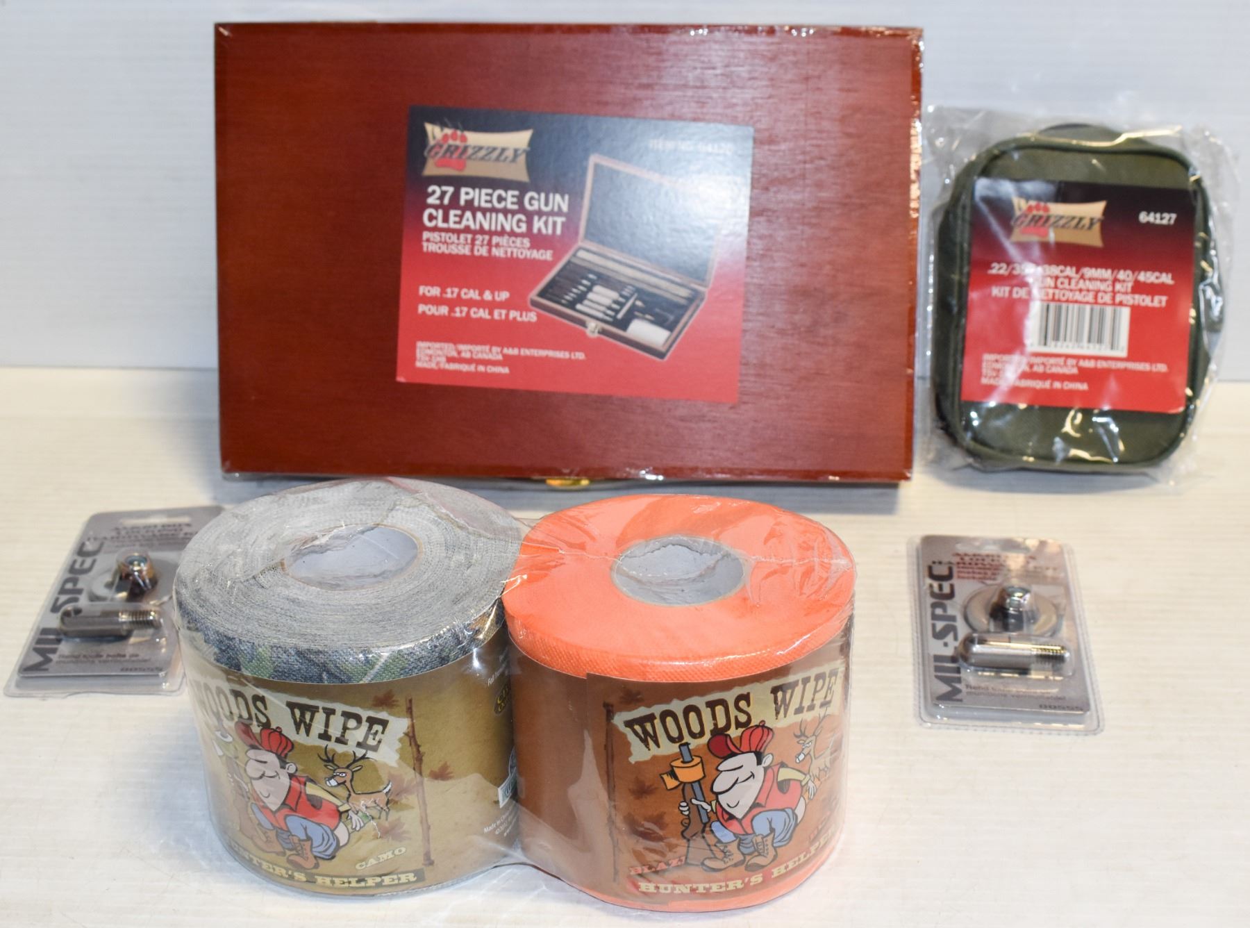 27 PC IN WOODEN BOX & GRIZZLY UNIVERSAL W/SEALED 2 AMMO BOX LOCKS & SEALED RIVERS EDGE WOODS WIPE BUCK SCHITZ CAMEO & BLAZC TOILET PAPER 2-PACK