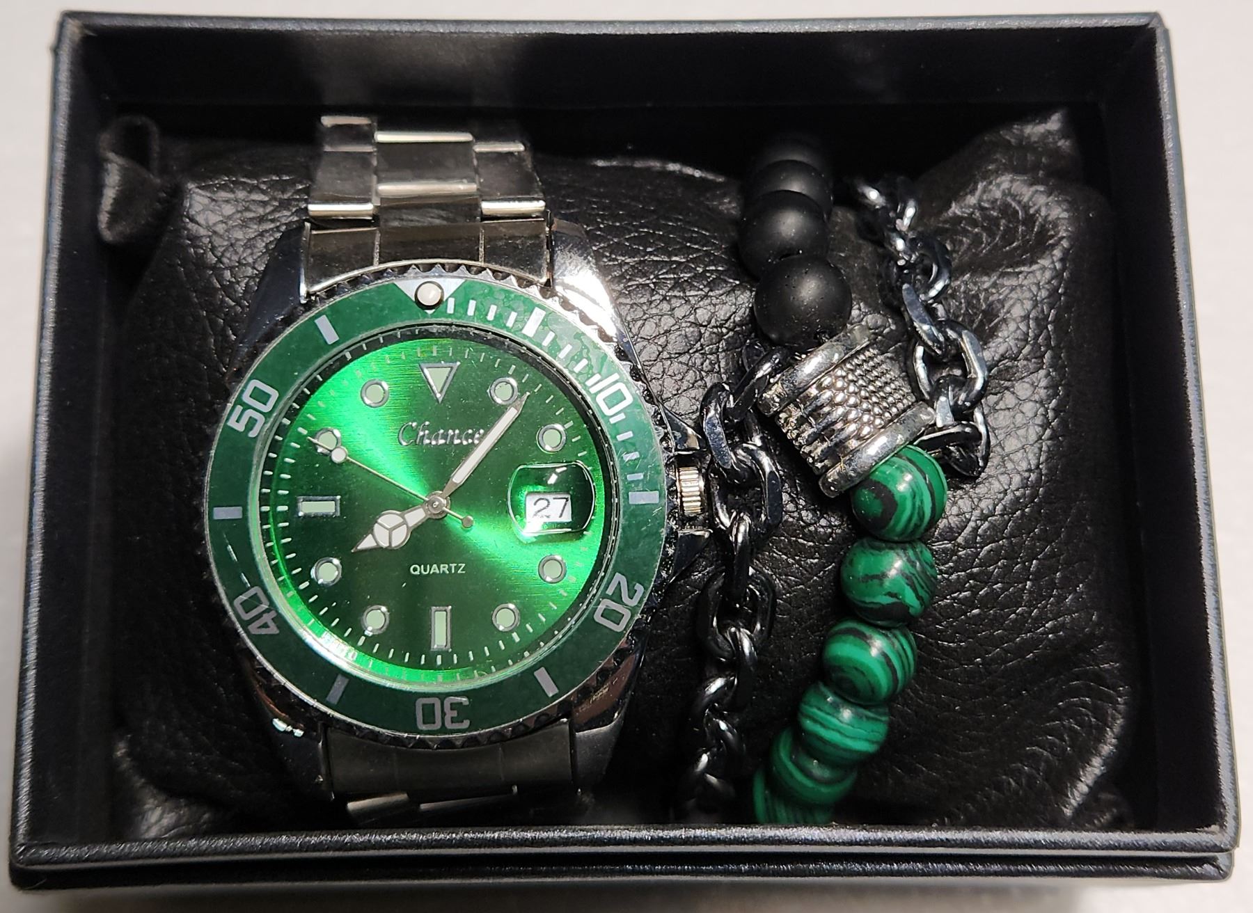 NEW 2 PC SET FASHIONABLE GREEN DIAL LUXURY WATCH