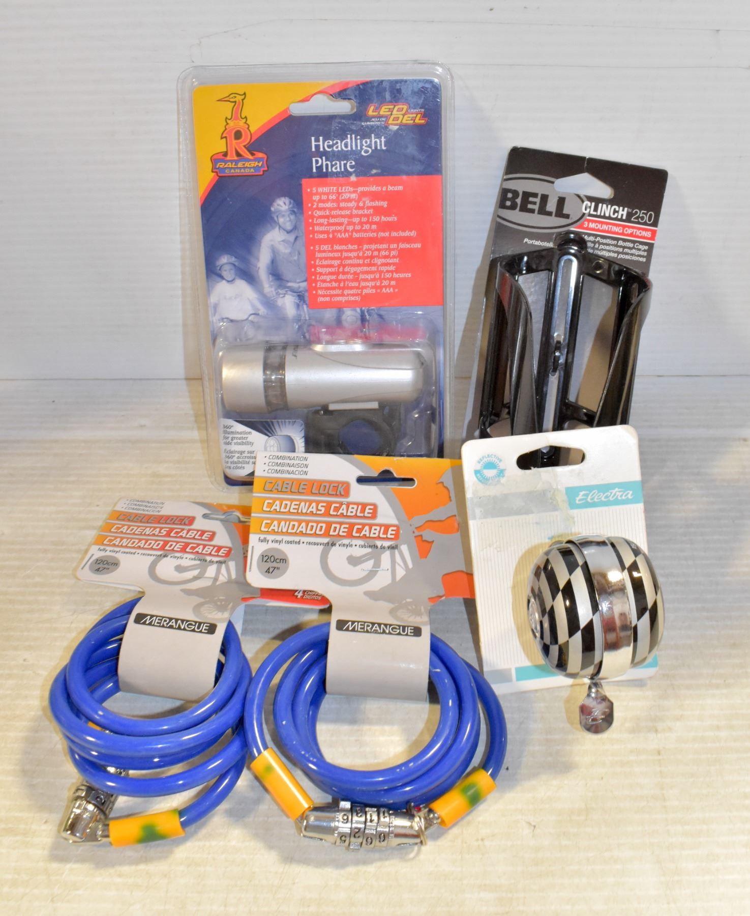 BOARD SPINNER BIKE BELL W/2 CABLE BIKE LOCKS W/BELL CLINCH BOTTLE CAGE, RALEIGH CANADA LED DEL HEADLIGHT