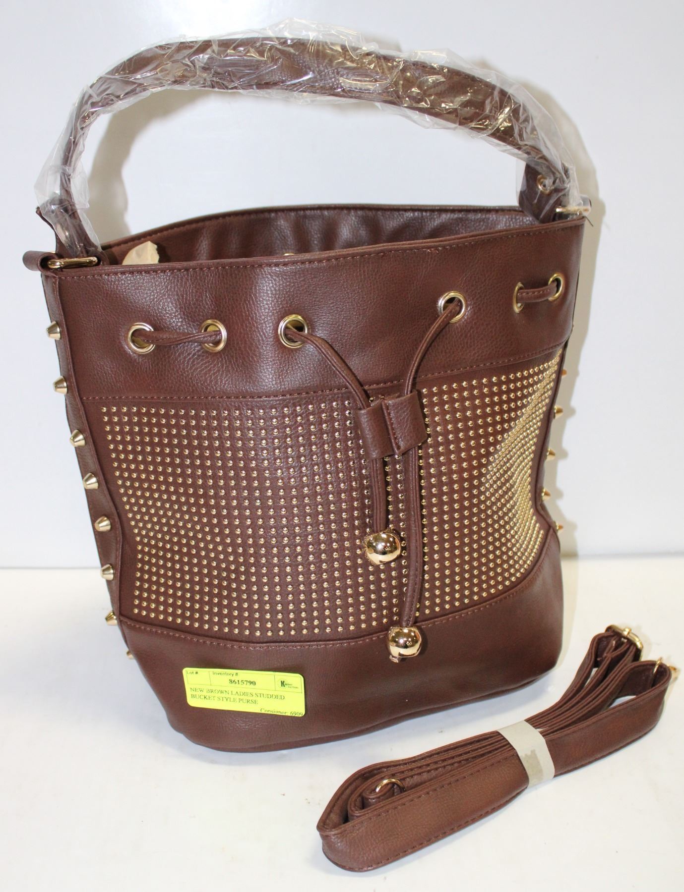 NEW BROWN LADIES STUDDED BUCKET STYLE PURSE