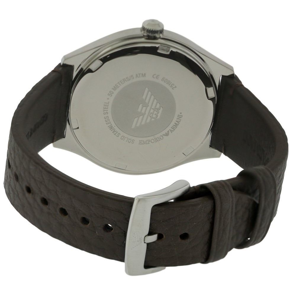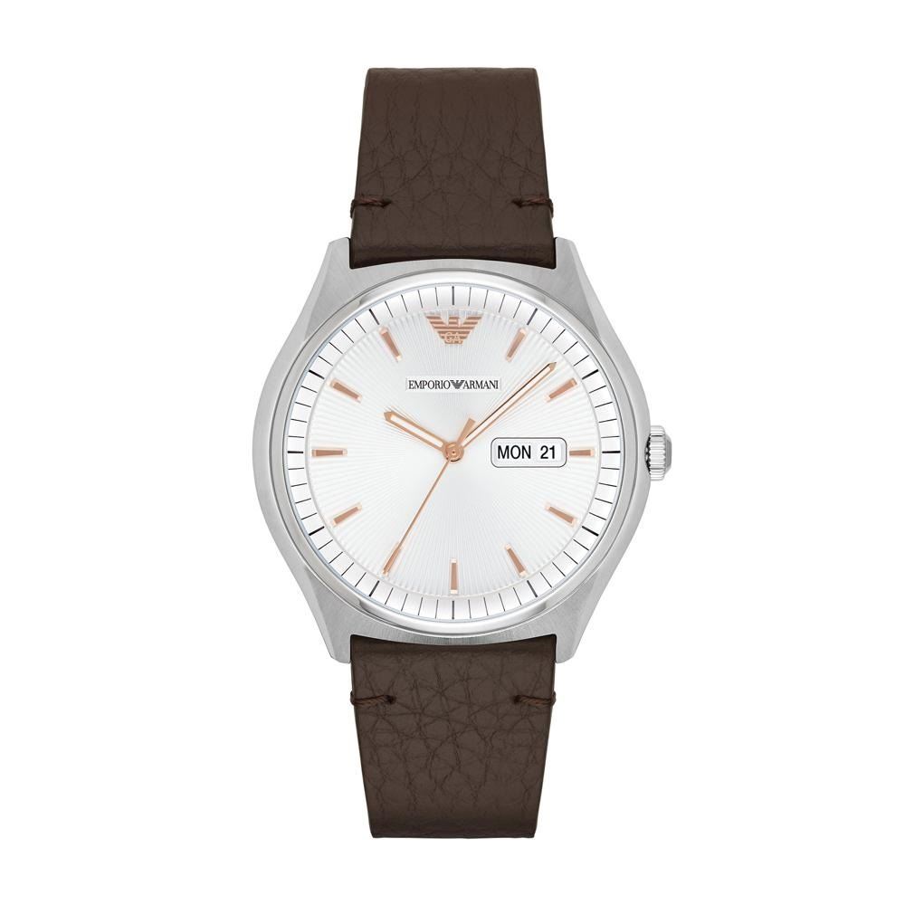 43MM DAY/DATE BROWN LEATHER STRAP WATCH. JEWELLERY.