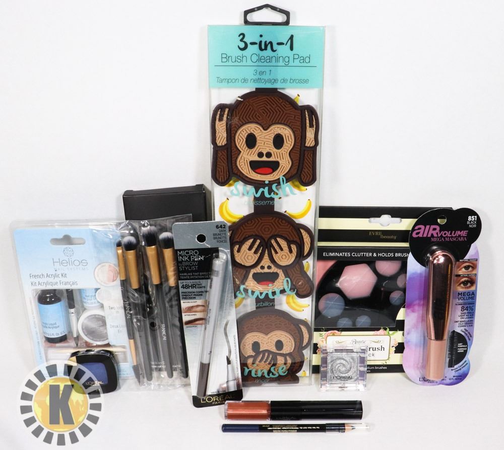 EYE LINER, 2 EYE SHADOWS, MASCARA, NAIL KIT, BRUSH CLEANING PAD AND DRYING RACK. PLUS MORE