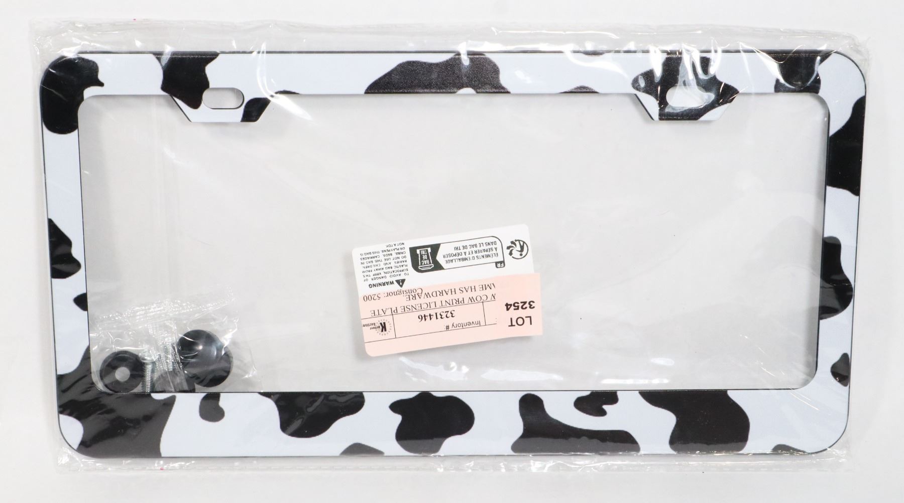 NEW COW PRINT LICENSE PLATE FRAME HAS HARDWARE