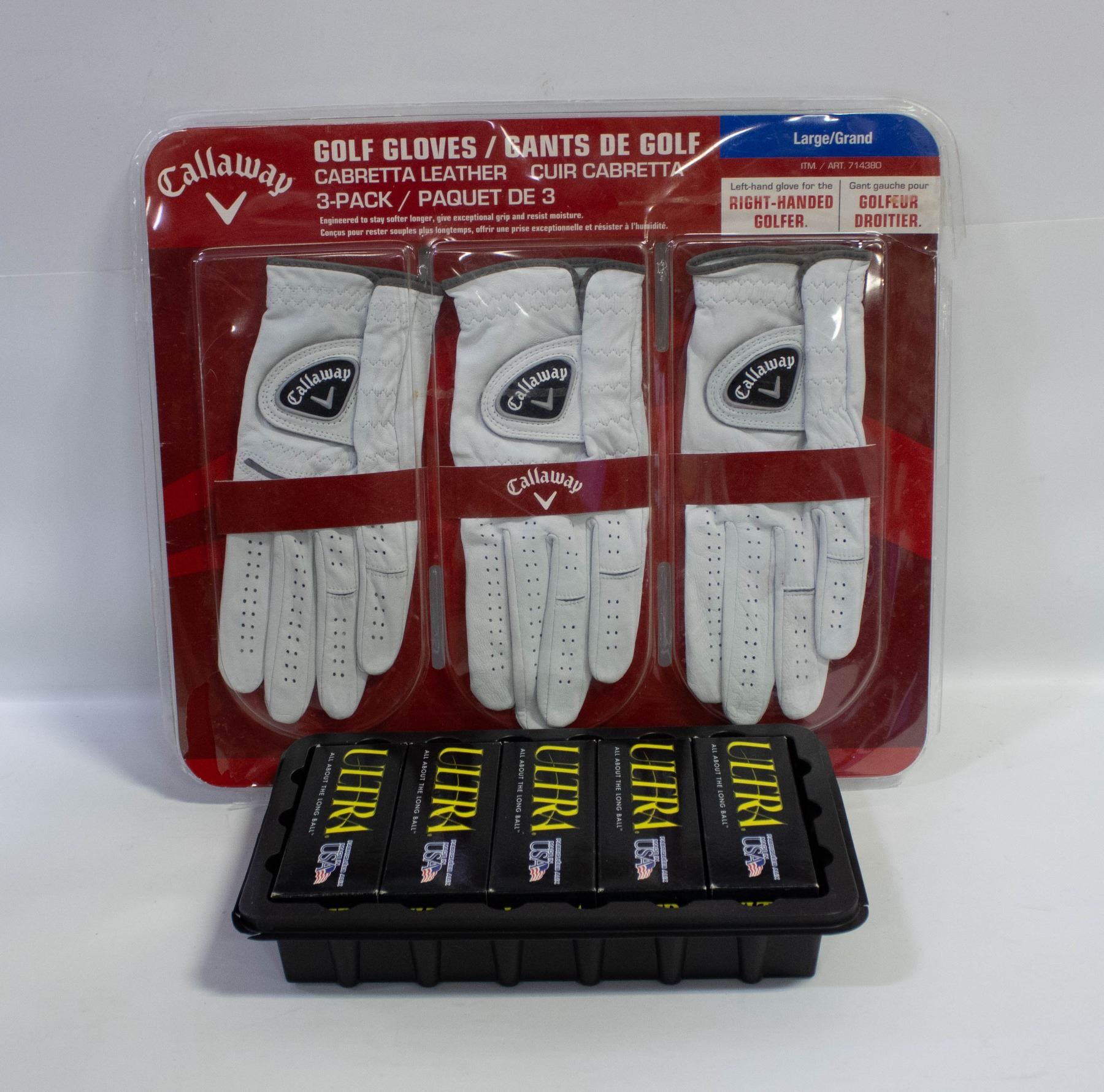 GLOVES CABRETTA LEATHER 3-PACK SIZE LARGE RIGHT HAND & ULTRA GOLF BALLS (X15) **ALL ITEMS MUST BE REMOVED BY 5PM SATURDAY, APRIL 4TH 2026. ALL REMAINING ITEMS WILL BE SUBJECT TO A $6.00 PER DAY STORAGE CHARGE. ANY ITEMS REMAINING AFTER MONDAY, APRIL 27TH 2026 WILL BE CONSIDERED FORFEITED. NO REFUNDS WILL BE ISSUED FOR FORFEITED ITEMS. TO SCHEDULE A PICK UP APPOINTMENT CLICK HERE