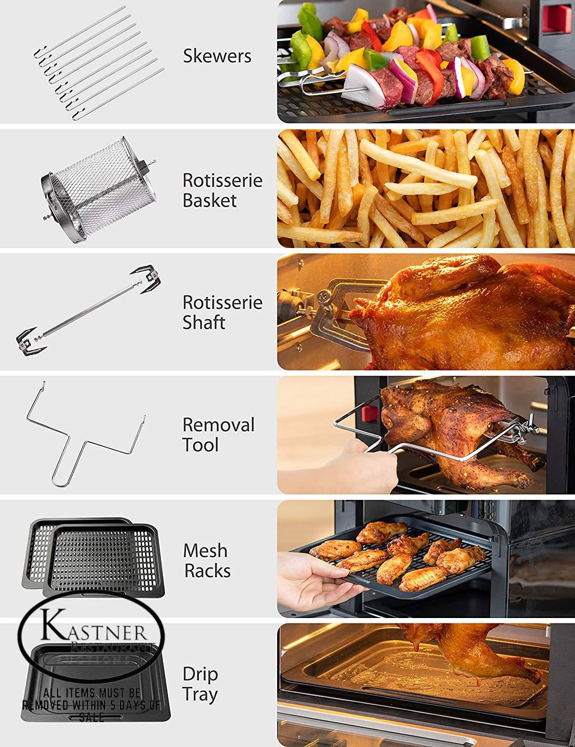 ROTISSERIE AND DEHYDRATOR, 6 ACCESSORIES, 32+ RECIPES, ETL CERTIFIED, MINOR DMG TO OUTER BOX, PARTS CHECKED, AMZ SES **ALL ITEMS MUST BE REMOVED BY 5PM MONDAY, AUGUST 1ST, 2022. ALL REMAINING ITEMS WILL BE SUBJECT TO A $6.00 PER DAY STORAGE CHARGE. ANY ITEMS REMAINING AFTER MONDAY, AUGUST 15, 2022 WILL BE CONSIDERED FORFEITED. NO REFUNDS WILL BE ISSUED FOR FORFEITED ITEMS.** TO SCHEDULE A PICK UP APPOINTMENT CLICK HERE