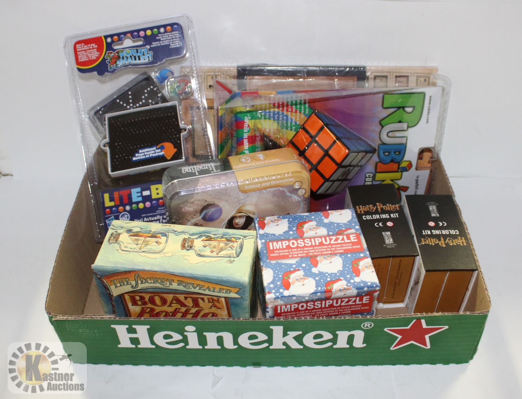 COLLECTIBLE COLORING MINI BOOKS, IMPOSSIPUZZLE 100 PC, TIMELINE SCIENCE DISCOVERIES, ORIGINAL RUBIK'S CUBE, THE SECRET REVEALED BOAT IN A BOTTLE KIT, WORLDS SMALLEST LITE-BRITE & MORE