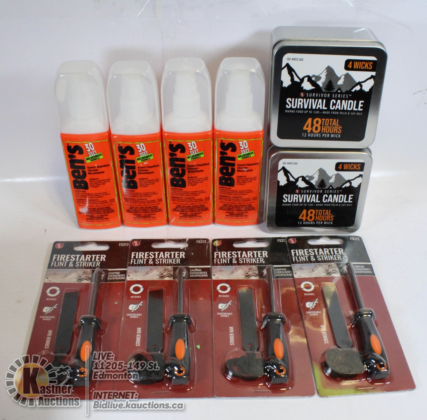 REPELLANT ECO-SPRAY 120 ML BOTTLES W/4 FIRE FLINT STRIKERS & (2) SURVIAL CANDLES 48 HOURS EACH (WARMS FOOD)
