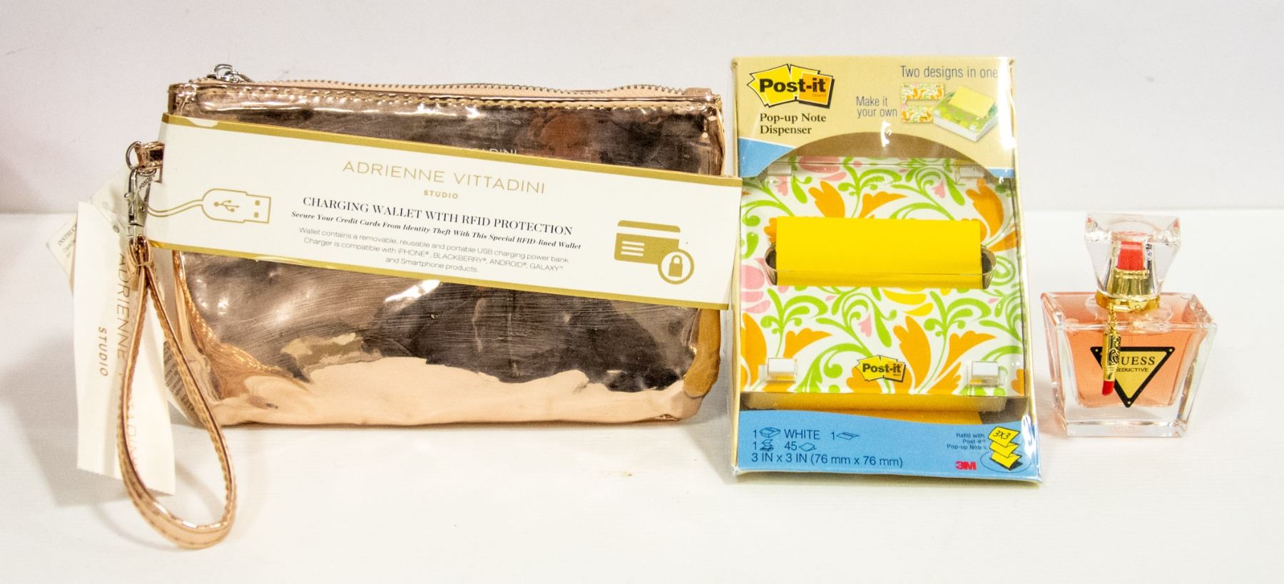 WRISTLET CHARGING WALLET DETACHABLE STRAP ROSE GOLD, POST-IT POP NOTE DISPENSER, 3" X 3", GUESS SEDUCTION EAU DE PARUM MADE IN SPAIN **SHIPPING NOT AVAILABLE**