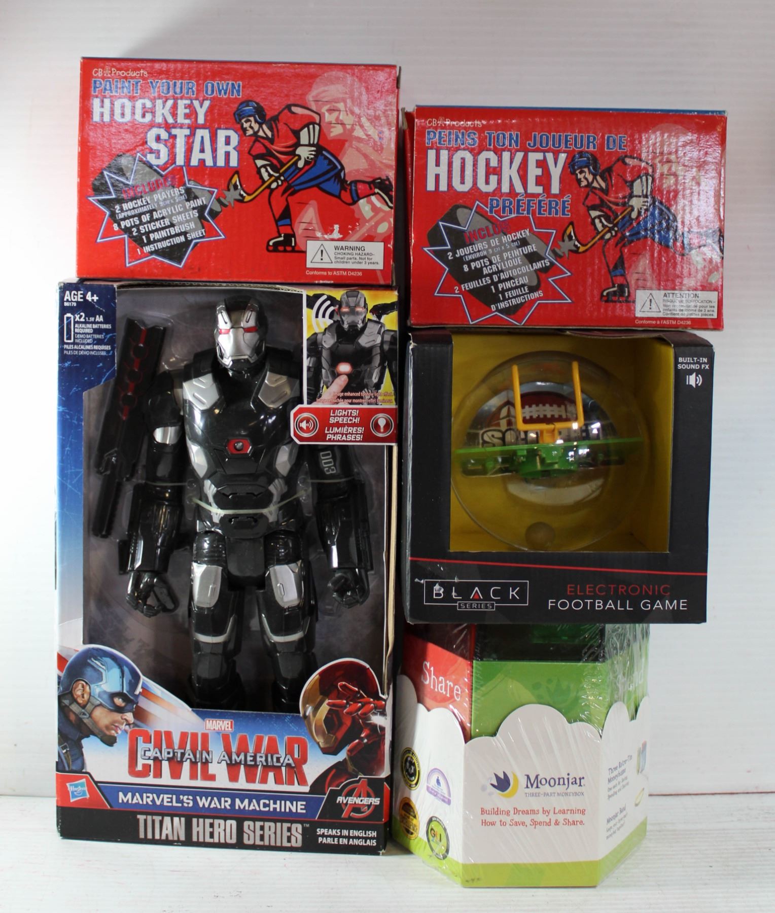 GAME, 2 PAINT YOUR OWN HOCKEY STAR, MOONJAR 3 PART MONEY BOX, MARVEL CIVIL WAR CAPTAIN AMERICA HERO SERIES
