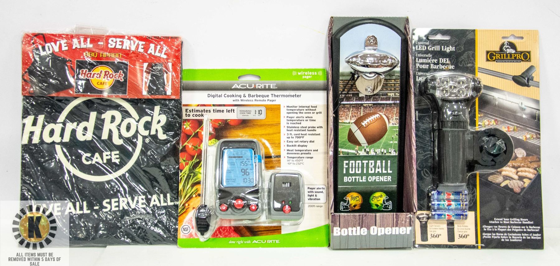 W/HARD ROCK CAF BBQ APRON ONE SIZE FITS ALL W/GRILLPRO UNIVERSAL LED GRILL LIGHT & ACURITE DIGITAL COOKING & BQ THERMOMETER WIRELESSALL ITEMS MUST BE REMOVED WITHIN 5 DAYS OF SALE