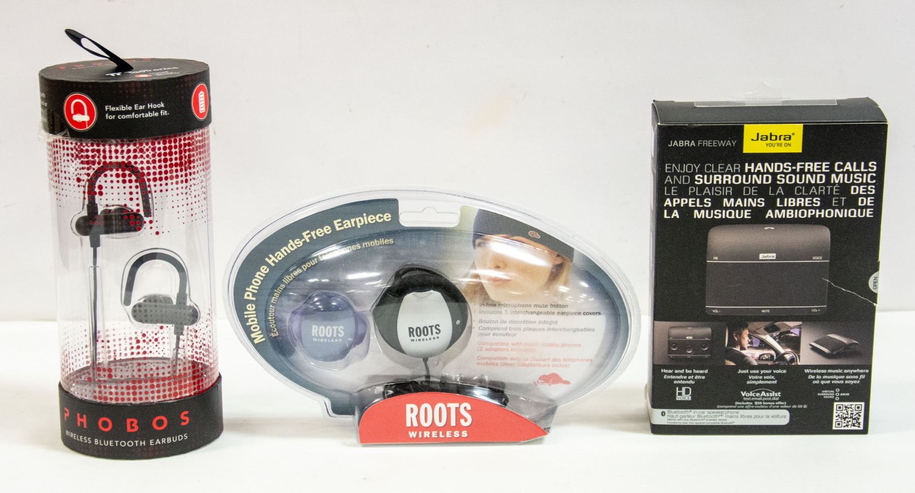 BLUETOOTH IN CAR SPEAKER PHONE W/PHOBOS WIRELESS BLUETOOTH EAR BUDS & ROOTS WIRELESS MOBILE PHONE HANDS-FREE EAR PIECE**ALL ITEMS MUST BE REMOVED BY 5PM MONDAY, OCTOBER 10TH, 2022. ALL REMAINING ITEMS WILL BE SUBJECT TO A $6.00 PER DAY STORAGE CHARGE. ANY ITEMS REMAINING AFTER MONDAY, OCTOBER 24TH, 2022 WILL BE CONSIDERED FORFEITED. NO REFUNDS WILL BE ISSUED FOR FORFEITED ITEMS. TO SCHEDULE A PICK UP APPOINTMENT CLICK HERE