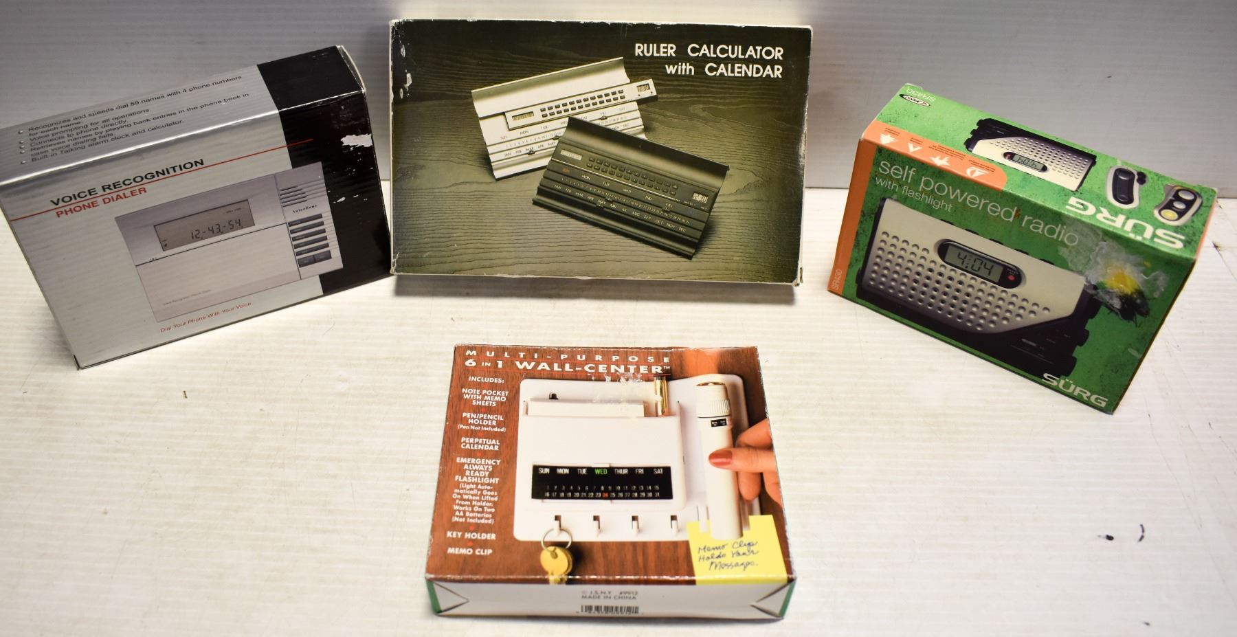 6 IN 1 WALL CENTRE, RULER CALCULATOR WITH CALENDAR, VOICE RECOGNITION PHONE DIALER, SELF POWERED RADIO WITH FLASHLIGHT CRANK HANDLE