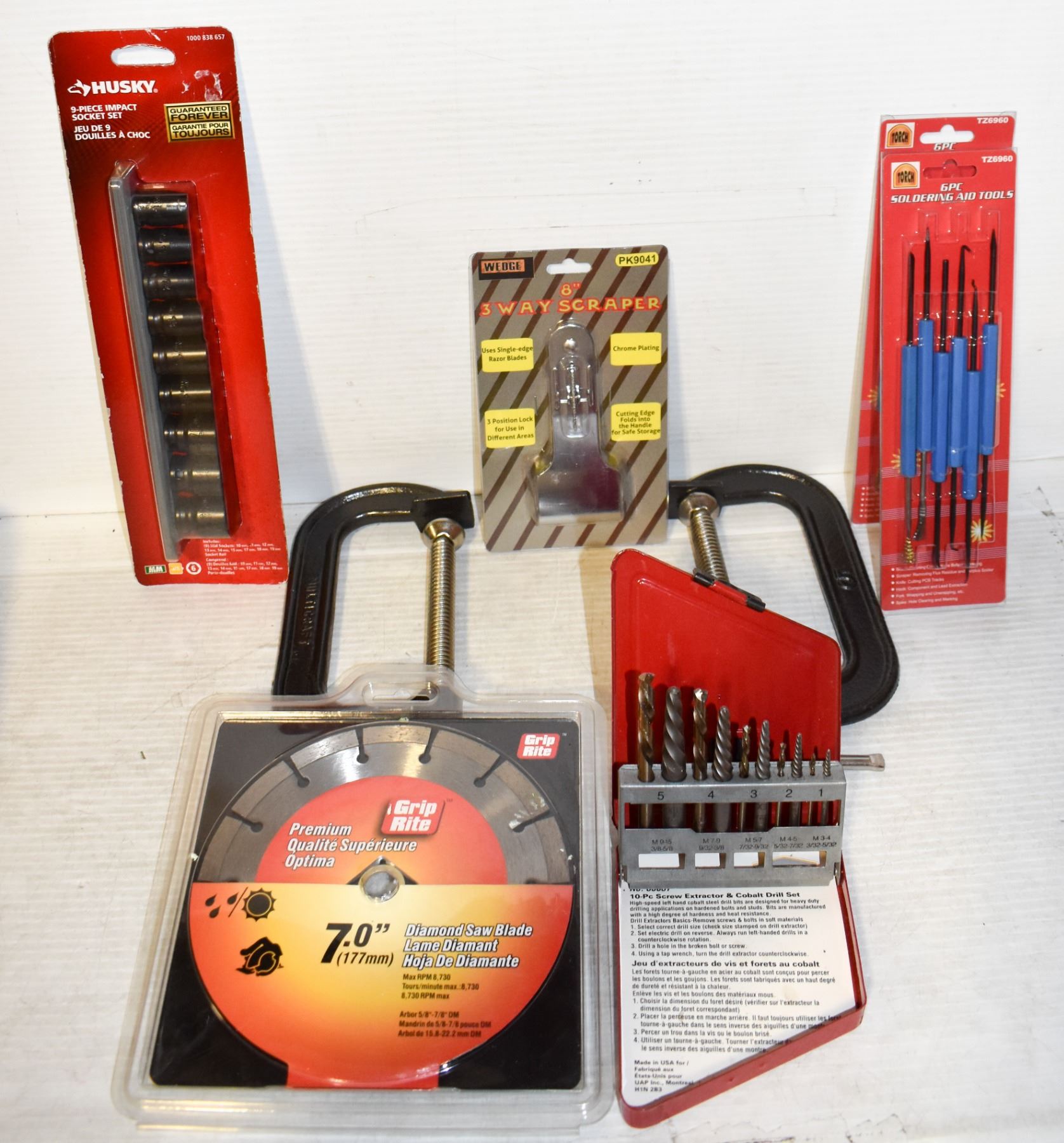 EXTRACTOR & COBALT DRILL SET, GRIPRITE PREMIUM 7.0" DIAMOND SAW BLADE, (2) 6 PC SOLDERING AID TOOLS, (2) 5" CLAMPS, HUSKY 9 PC IMPACT SOCKET SET, 8" 3 WAY SCRAPER