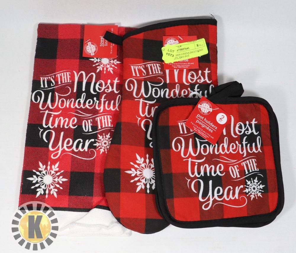 NEW KITCHEN LINENS INCLUDING OVEN MITT, TWO POT