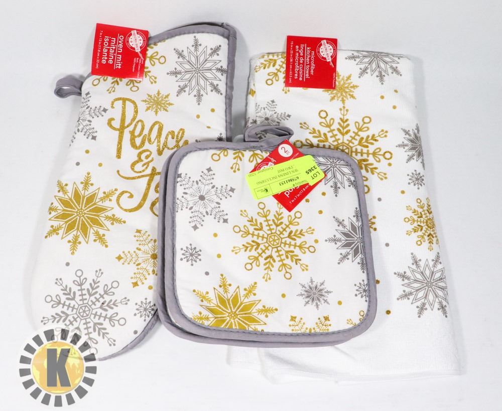 NEW KITCHEN LINENS INCLUDING OVEN MITT, TWO POT