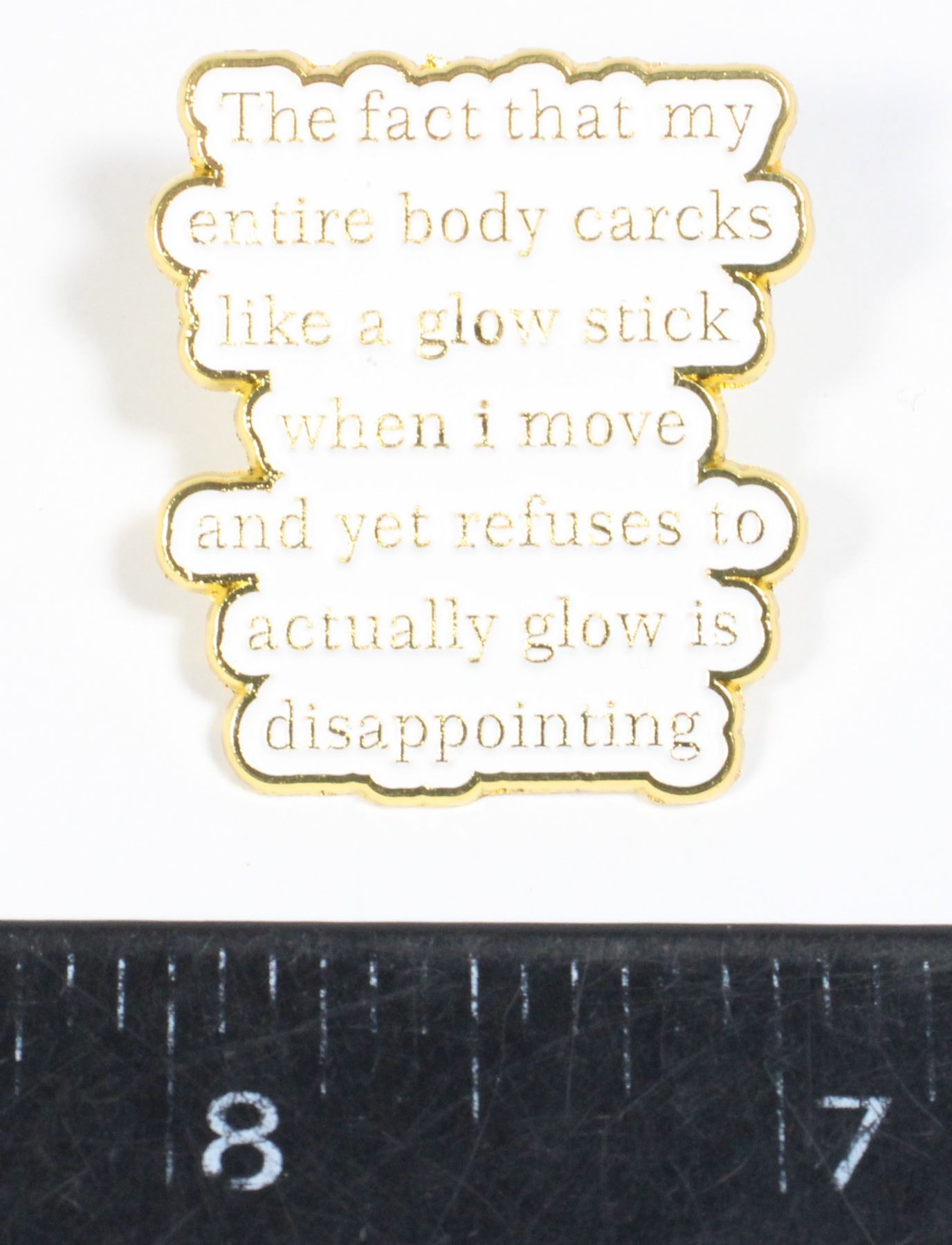 LIKE A GLOW STICK WHEN I MOVE AND YET REFUSES TO ACTUALLY GLOW IS DISAPPOINTING. THAT IS HOW CRACKS IS SPELLED ON THE PIN.