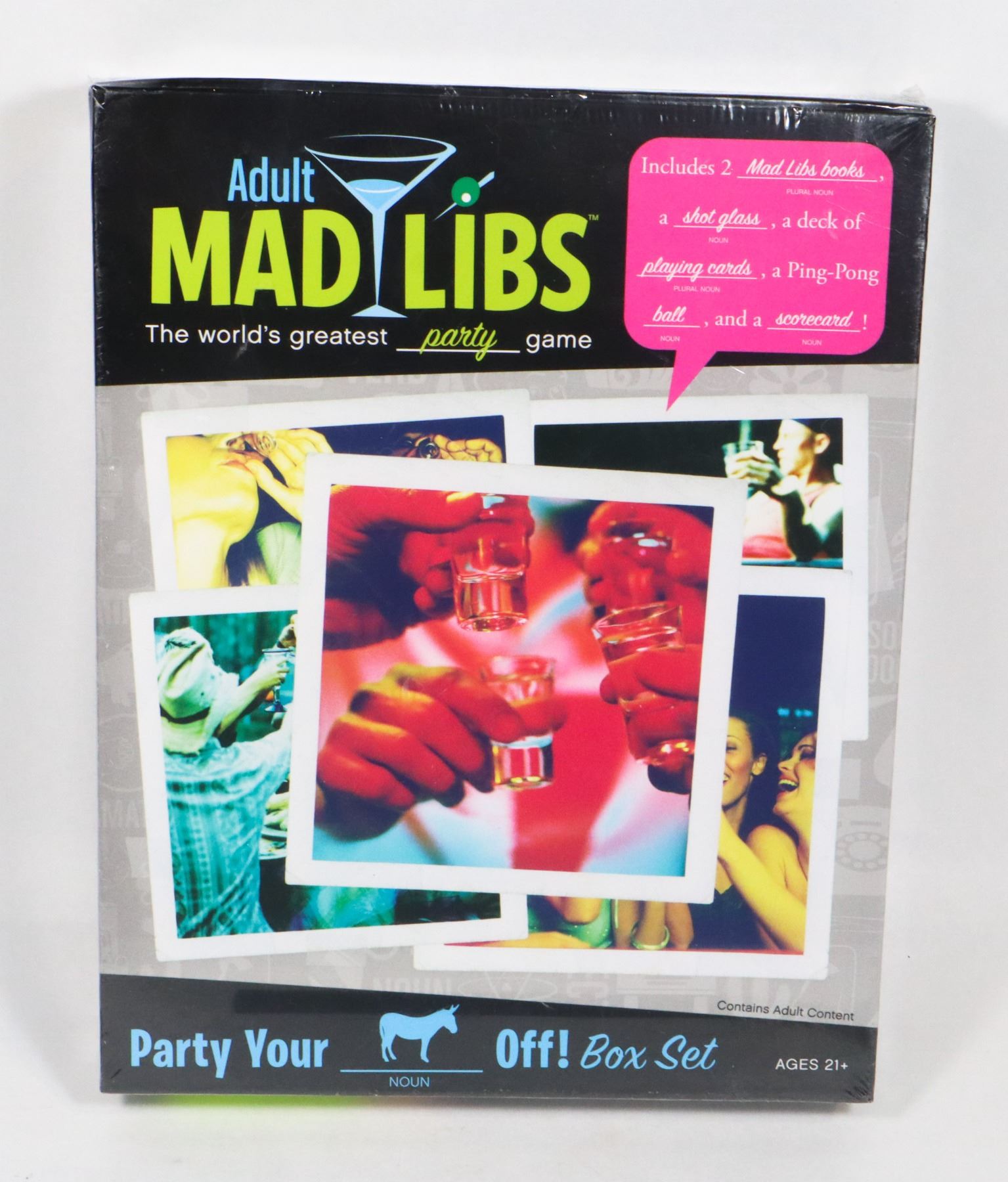 INCLUDES 2 MAD LIBS BOOKS, A SHOT GLASS, DECK OF PLAYING CARDS, A PING PONG BALL AND SCORE CARD.