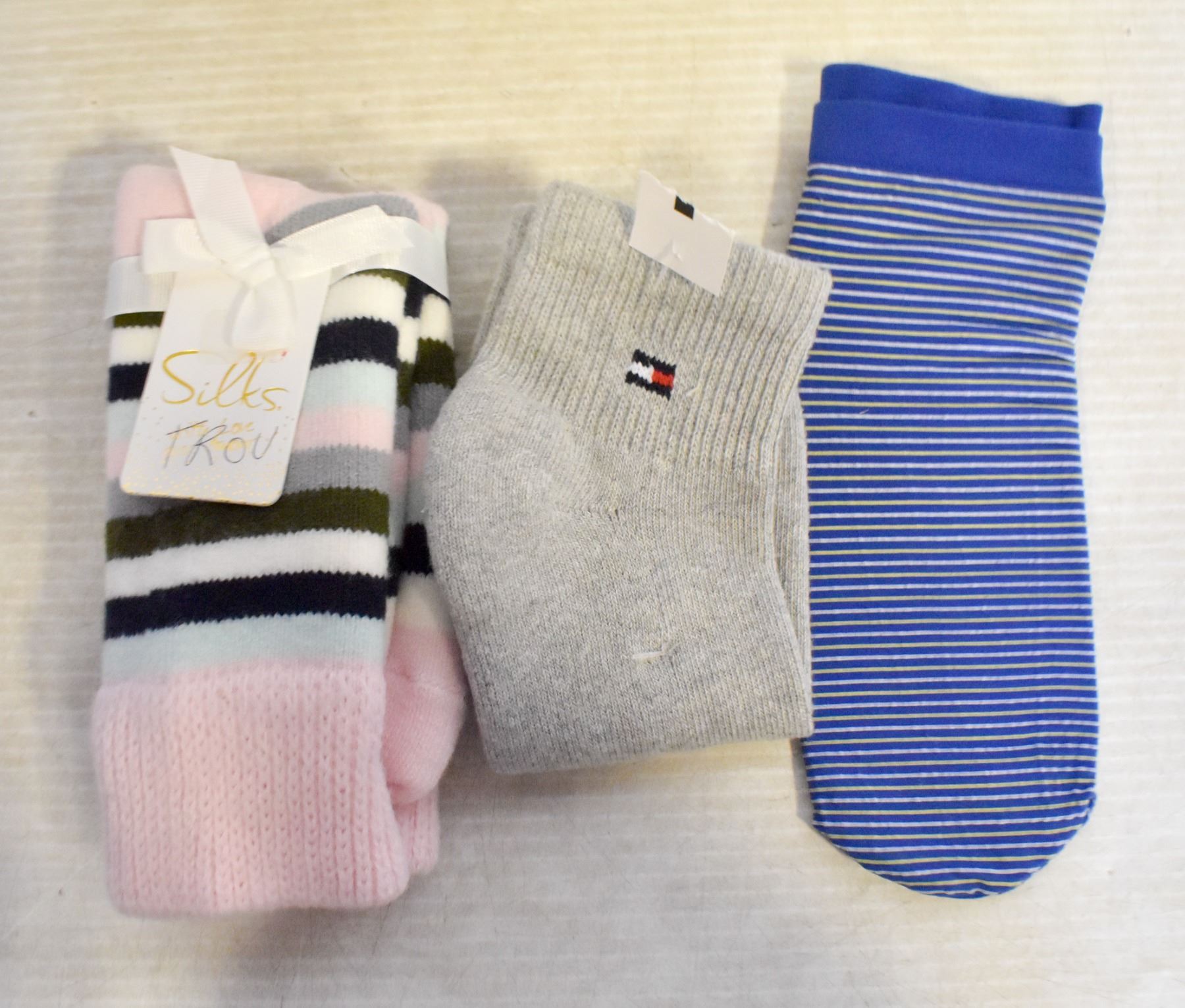 2 X SILKS LADIES NON SLIP SOCKS, PAIR OF BLUE STRIPED WICKING SOCKS AND PAIR OF TOMMY HILFIGER GREY SOCKS, HBC SES