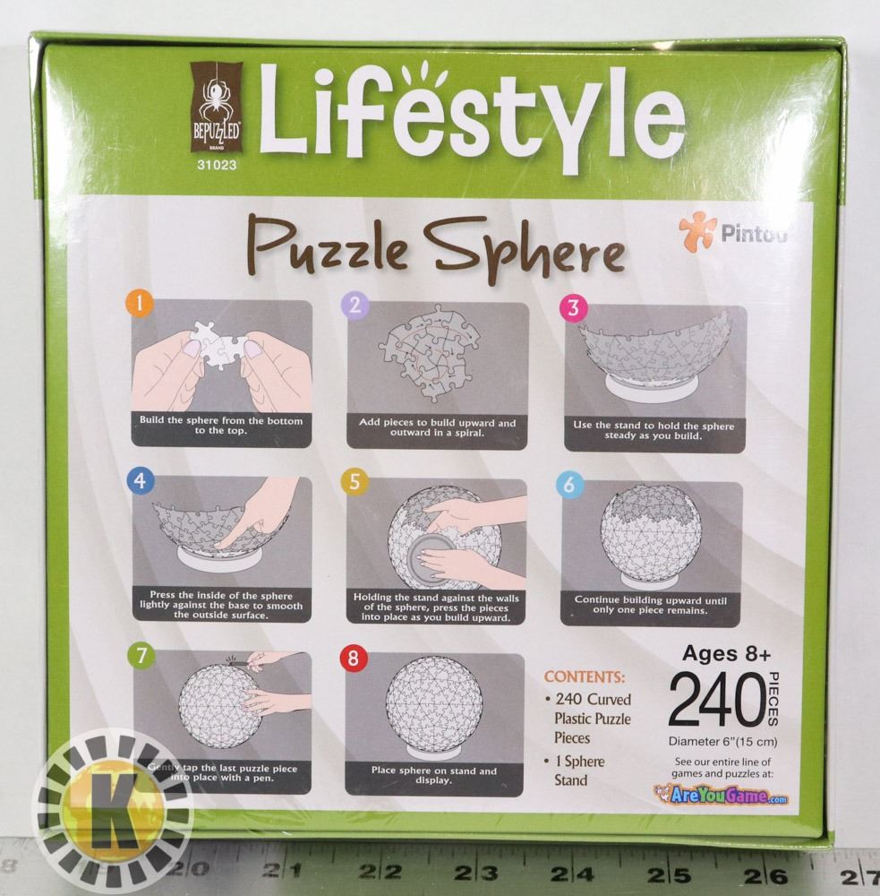FOR AGES 8+. 2 SKULL DESIGNS IN 1 PUZZLE. DIAMETER 6"(15CM) CONTAINS STAND