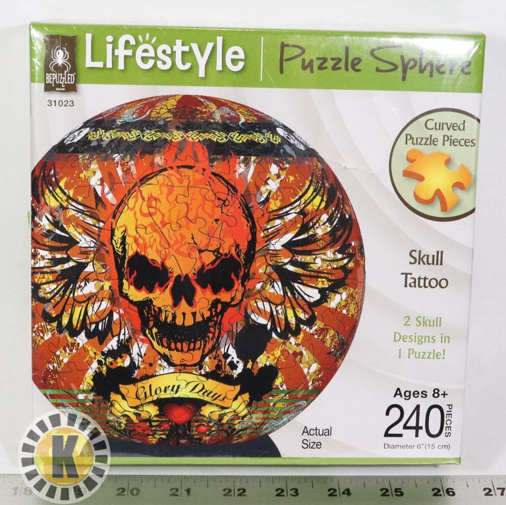 FOR AGES 8+. 2 SKULL DESIGNS IN 1 PUZZLE. DIAMETER 6"(15CM) CONTAINS STAND