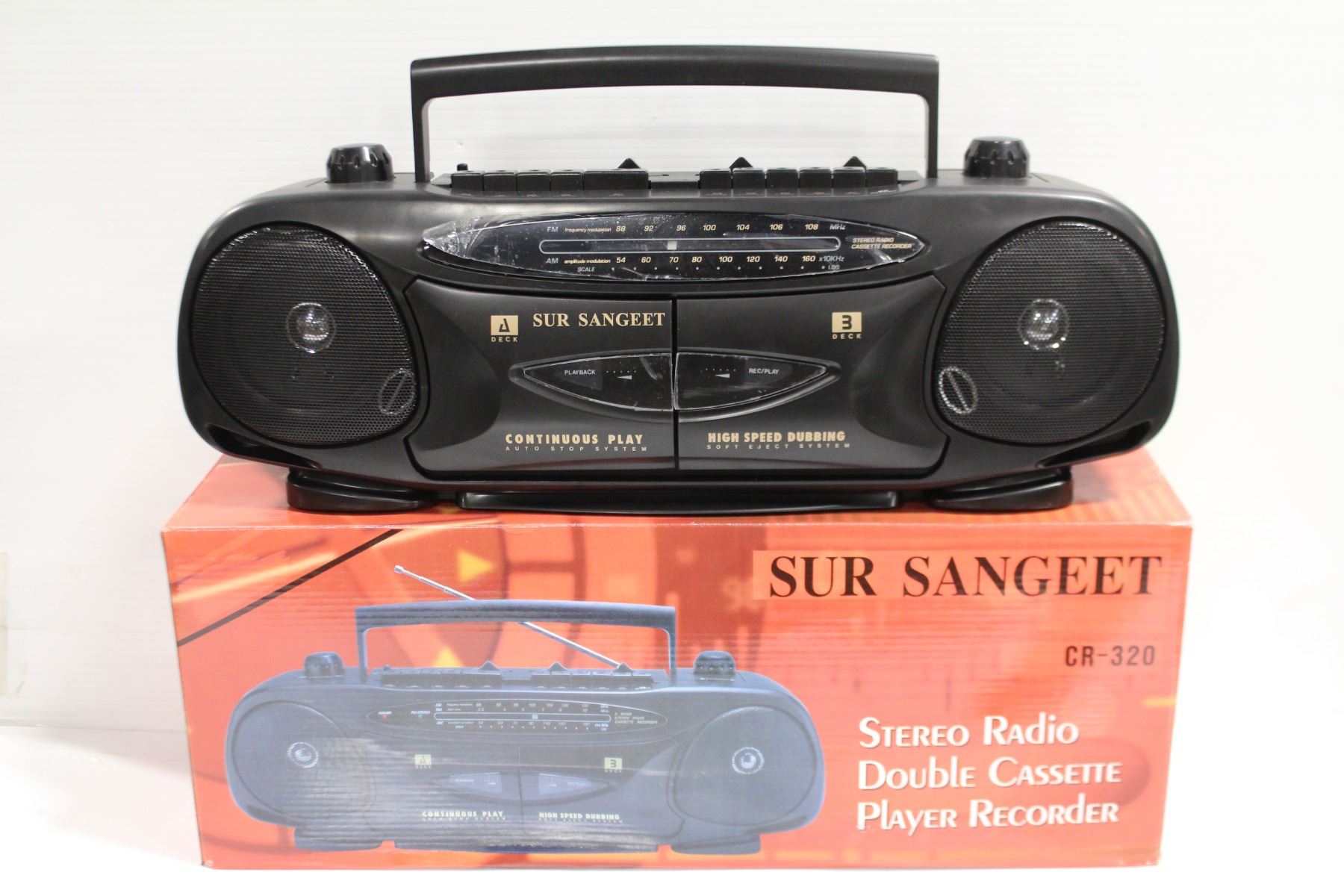 NEW IN BOX. M# CR-320, CAPABLE OF STEREO, RADIO, DOUBLE CASSETTE PLAYER RECORDER. AM/FM 2 BRAND RADIO, FM STEREO INDICATOR, SOFT EJECT DOOR, AUTO STOP RECORDER, HEADPHONE JACK, BUILT IN CONDENSER MICROPHONE , AC/DC OPERATION, CHROME KNOBS(OPTIONAL). POWER SOURCE: 9V DC CORD, OR SIX UM-1/D-SIZE/R20(BATTERIES NOT INCLUDED) **ALL ITEMS MUST BE REMOVED BY 5PM MONDAY, NOVEMBER 7TH, 2022. ALL REMAINING ITEMS WILL BE SUBJECT TO A $6.00 PER DAY STORAGE CHARGE. ANY ITEMS REMAINING AFTER MONDAY, NOVEMBER 28, 2022 WILL BE CONSIDERED FORFEITED. NO REFUNDS WILL BE ISSUED FOR FORFEITED ITEMS. TO SCHEDULE A PICK UP APPOINTMENT CLICK HERE