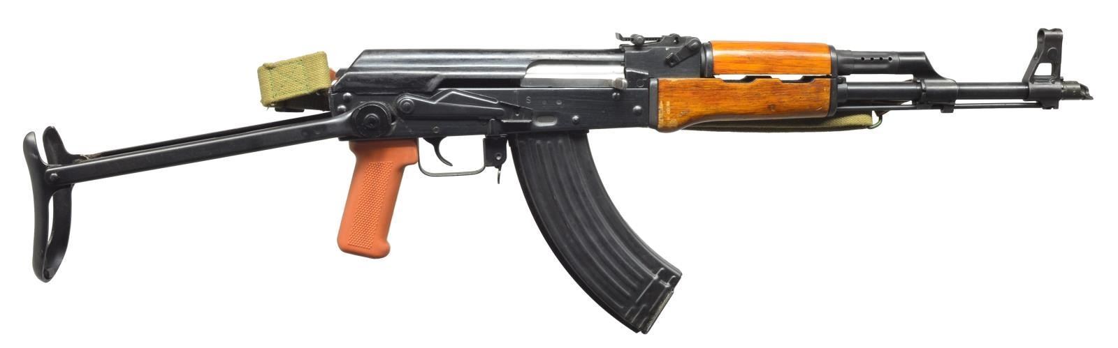 Cal. 7.62X39. S# 1611737. Bbl. 16". A very early semi-auto under folding AK-47 variant imported from Norinco, China through SILE NY, NY. Blued finish on exposed metal surfaces. Front trunnion marked "156S" along w/ the triangle 66 Arsenal mark. Import markings on left side of receiver. "MADE IN CHINA"/ "SILE N.Y. N.Y." w/ familiar Norinco logo. Correct yellow/red tinted wooden furniture & plastic pistol grip w/ under folding stock. Reinforced stamped receiver. Proper slant muzzle break in front of hooded post front sight. Gas block/ bayonet lug play host to on board cleaning rod. Tangent rear sight marked to 800 meters. Right side controls. Matching numbers on several sm. parts & receiver. Left side mounted faded green canvas sling. MAGS: 1 metal 30 rd. CONDITION: exterior surfaces still retain the vast majority of their original finish. Some areas of thinning in receiver & handguard wear due to mechanical intervention w/ stock. Front sight block has a few sm. spots of weld, possibly separated earlier from the now correct functioning break. Shiny bore w/ strong rifling. Fire control mechanism appears to function correctly when cycled by hand. (21-1452/JZ). MODERN. $1,000-1,500.