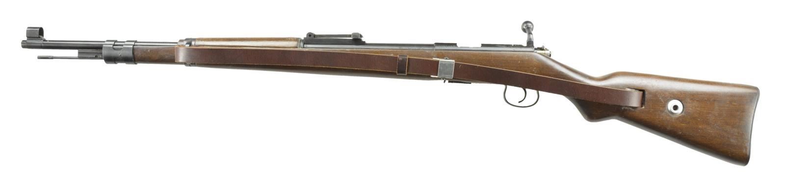 Cal. 22 LR. S# 9203689. Mfg. to emulate German WWII 98K rifles & imported by Navy Arms. Bbl. 26" w/ hooded blade front sight & 200m tangent rear. Grooved receiver for scope mts. Hardwood stock set w/ German military style sling. MAGS: 2 -10 rd. UNATTACHED ACCESSORIES: matching numbered foam lined box w/ spare mag. CONDITION: very good overall w/ white mildew stains throughout, handling wear & other storage residue. Near excellent bore. PROVENANCE: from the estate collections of Charles P. Obremski. (22-1349/MD). MODERN. $200-400.