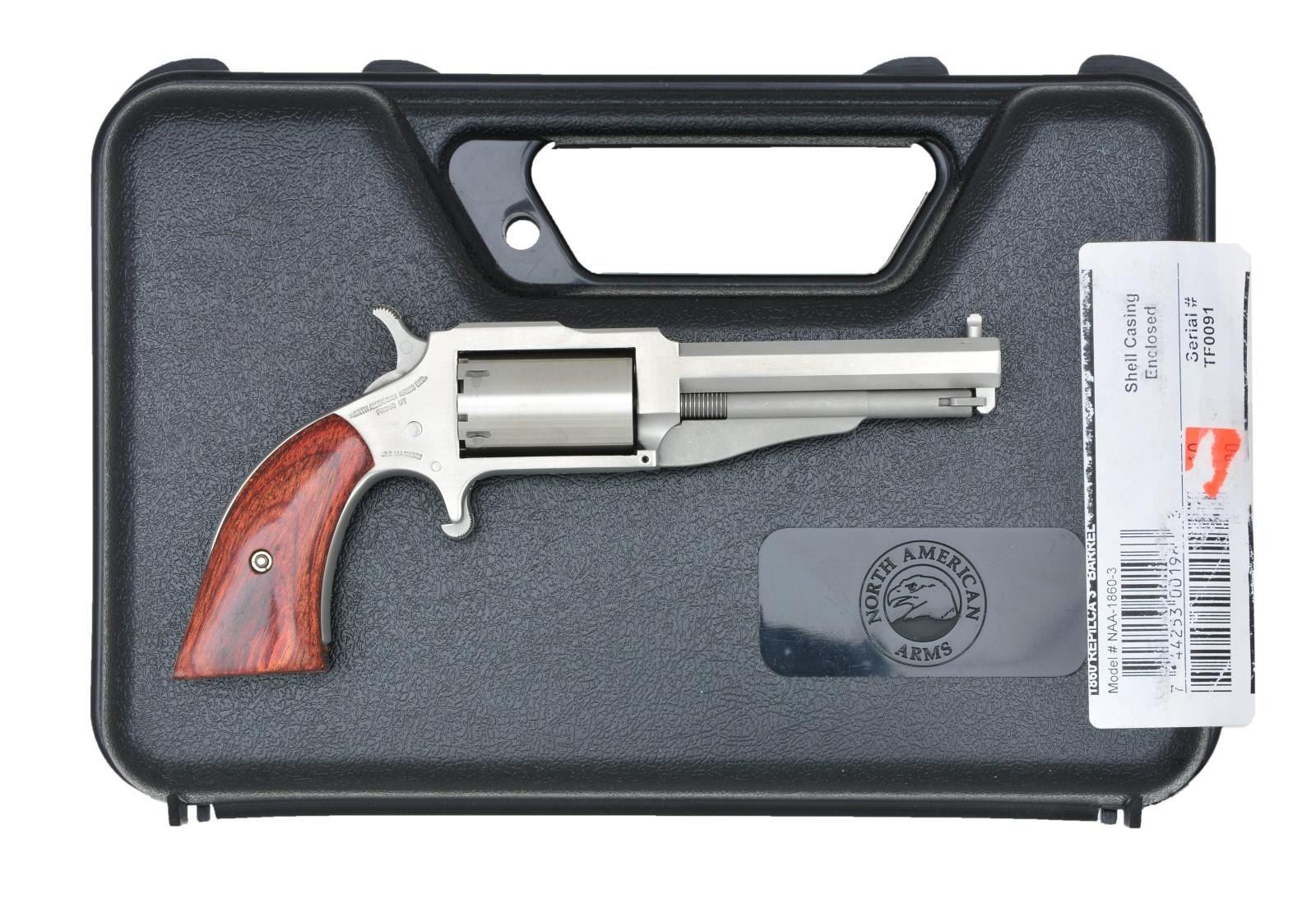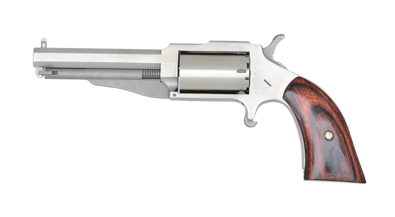 Cal. 22 Mag. S# TF0091. Bbl. 3" octagon w/ black powder style front sight. Mfg. starting 2009 as stainless w/ 5 rd. unfluted cyl., spur trigger, grooved top strap, cyl. latch resembling loading lever & laminated rosewood square butt grips on birdshead grip frame. UNATTACHED ACCESSORIES: factory black plastic case & paperwork. CONDITION: all aspects near excellent; appears new. PROVENANCE: Estate collection of Fred Inganamort. (22-1777/NW). MODERN. $200-300.