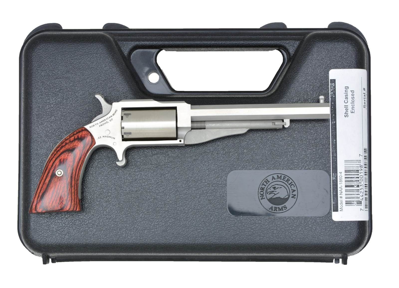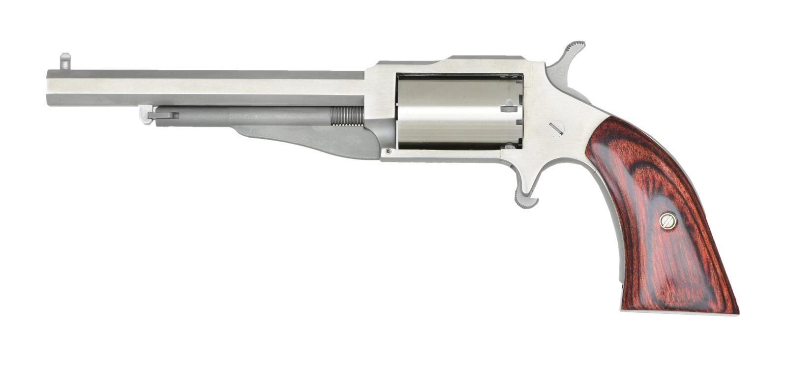 Cal. 22 Mag. S# TE3747. Bbl. 4" octagon w/ black powder style front sight. Mfg. starting 2009 as stainless w/ 5 rd. unfluted cyl., spur trigger, grooved top strap, cyl. latch resembling loading lever & laminated rosewood square butt grips on birdshead grip frame. UNATTACHED ACCESSORIES: factory black plastic case & paperwork. CONDITION: all aspects near excellent; appears new. PROVENANCE: Estate Collection of Fred Inganamort. (22-1786/NW). MODERN. $200-300.
