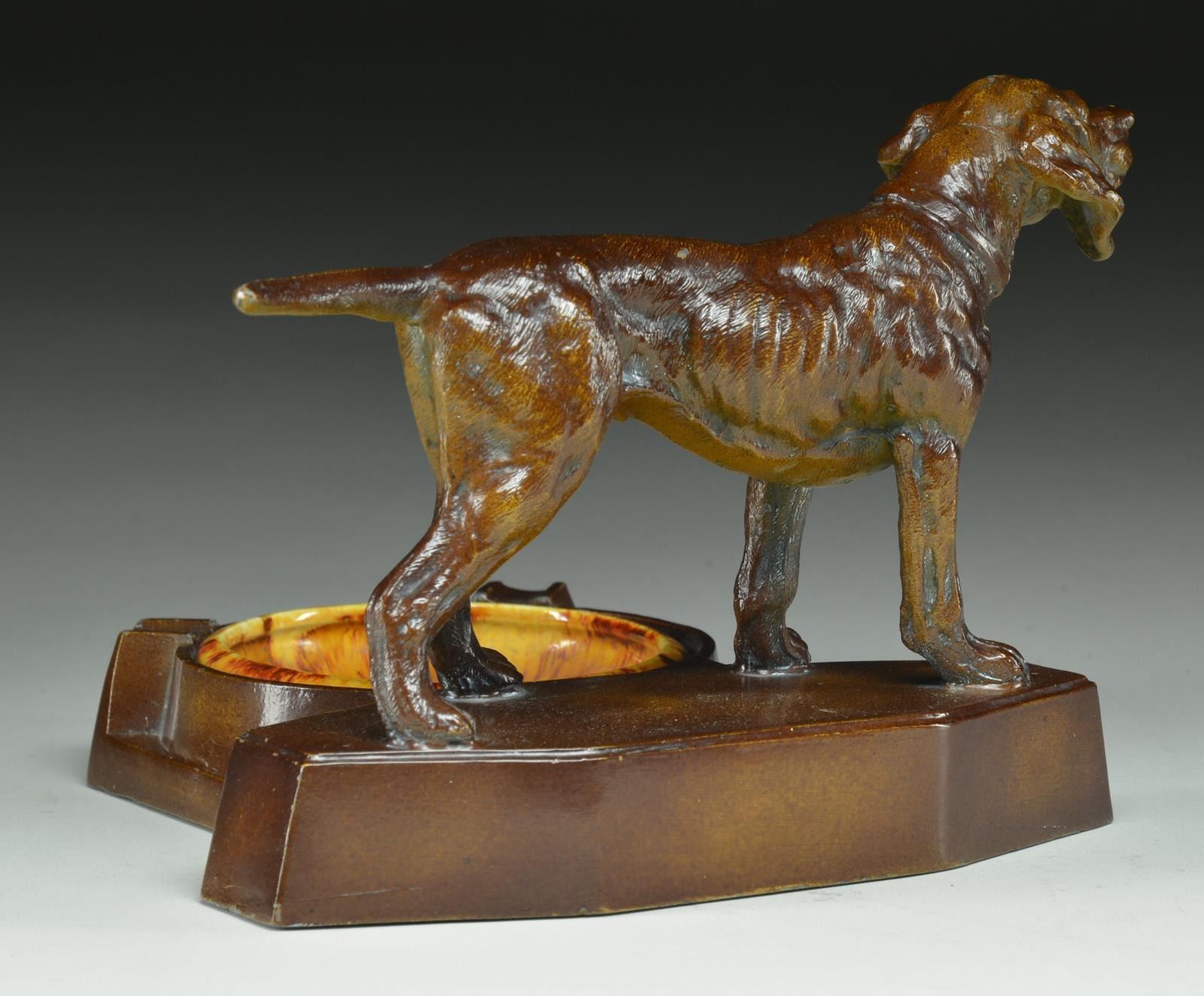8" x 8" x 8" piece that consist of a cast metal Boundhound on a wooden. Removeable ash tray along side the dog has "NUART/10" signature on bottom. CONDITION: Good plus overall w/ edge wear & flaking finish throughout. PROVENANCE: From the Collection of Thomas B. & Freeda Harper Jr. (02-16528/MD). $50-100.