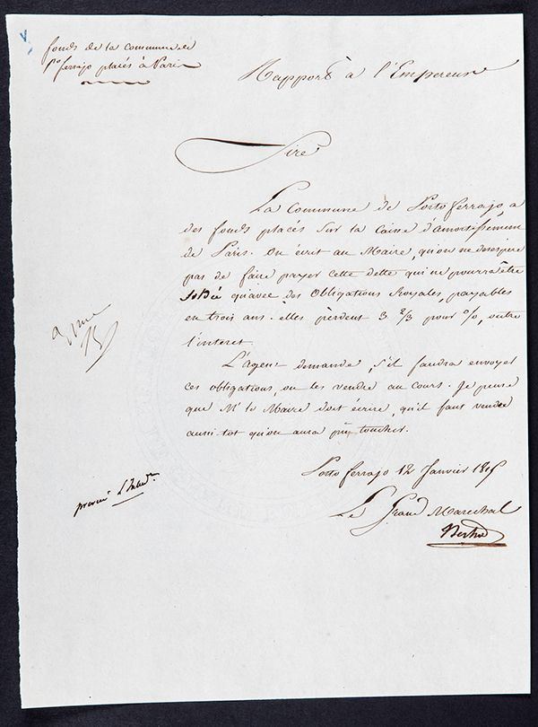 Napoleon I. Endorsement and signature "Approved N" on a report presented to him by General Bertrand, 1 page, in French, 8� x 11 in., Porto Ferragio, 12 January 1815. Regarding terms of a debt payment. Bertrand (1773-1844) was with Napoleon in all his campaigns and accompanied him into exile on both Elba and St. Helena. Anything signed by Napoleon while on Elba is rare.