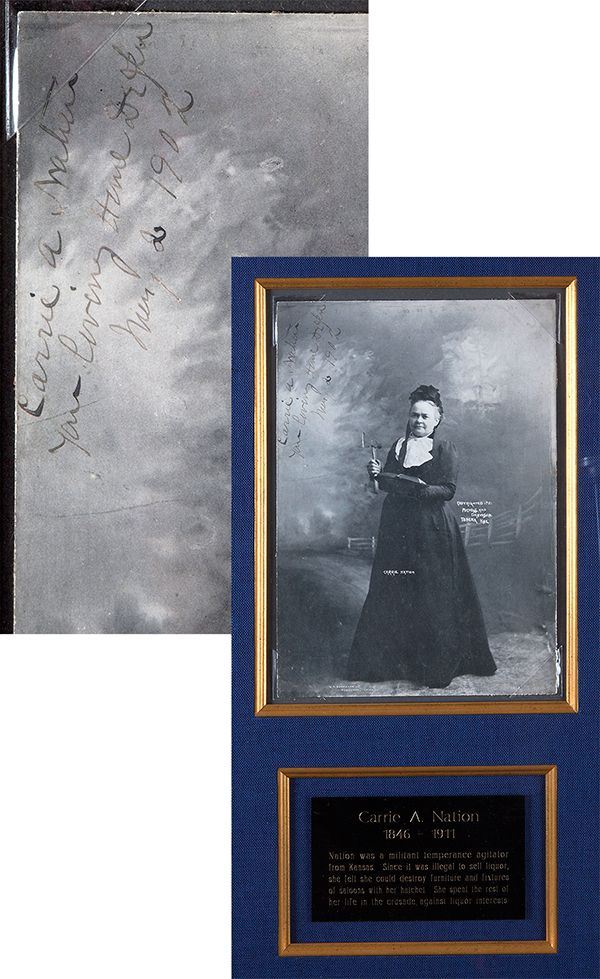 Nation, Carrie (1846-1911) Radical member of the temperance movement; she often attacked establishments which served alcohol with a hatchet. Later in life, to earn money, she sold photographs of herself, collected lecture fees, and marketed miniature souvenir hatchets. Photograph inscribed and signed "Carrie A. Nation / Your loving Home Defender / May 2, 1902" vertically, in the upper left corner, 6� x 9� in. The photo shows her holding a Bible in one hand and a hatchet in the other, with "Copyrighted 1901 / Michols and Davidson, Topeka, Kas." imprinted, along with her name. Matted with a biographical plaque and framed to an overall size of 16 x 25 in.