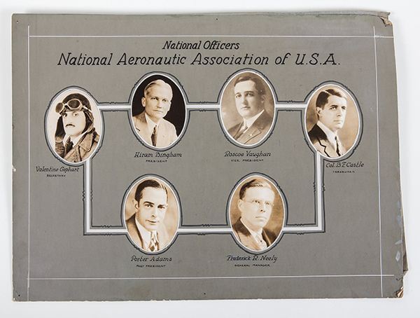 "National Officers / National Aeronautical Association of the Usa". An unusual 14x10�" gray original advertising display board featuring oval B&W photos of six Natiopnal Officers of the Association. Each photo is outlined in white ink. Included are photos of Hiram Bingham (President), Roscor Vaughn (VP), Valentine Gephart (Secretary), Col. B. F. Castle (Treasurer), Porter Adams (Past President), and Frederick Neely (GM). This piece was created as part of an advertising campaign by Ahlm & Co, Cleveland (Ohio). It includes its original gray paper overlay and is in generally excellent condition with minor edge faults and pin holes at the corners. Ex. The Cliff Henderson Estate Collection and the Michael Orenstein Estate Collection.