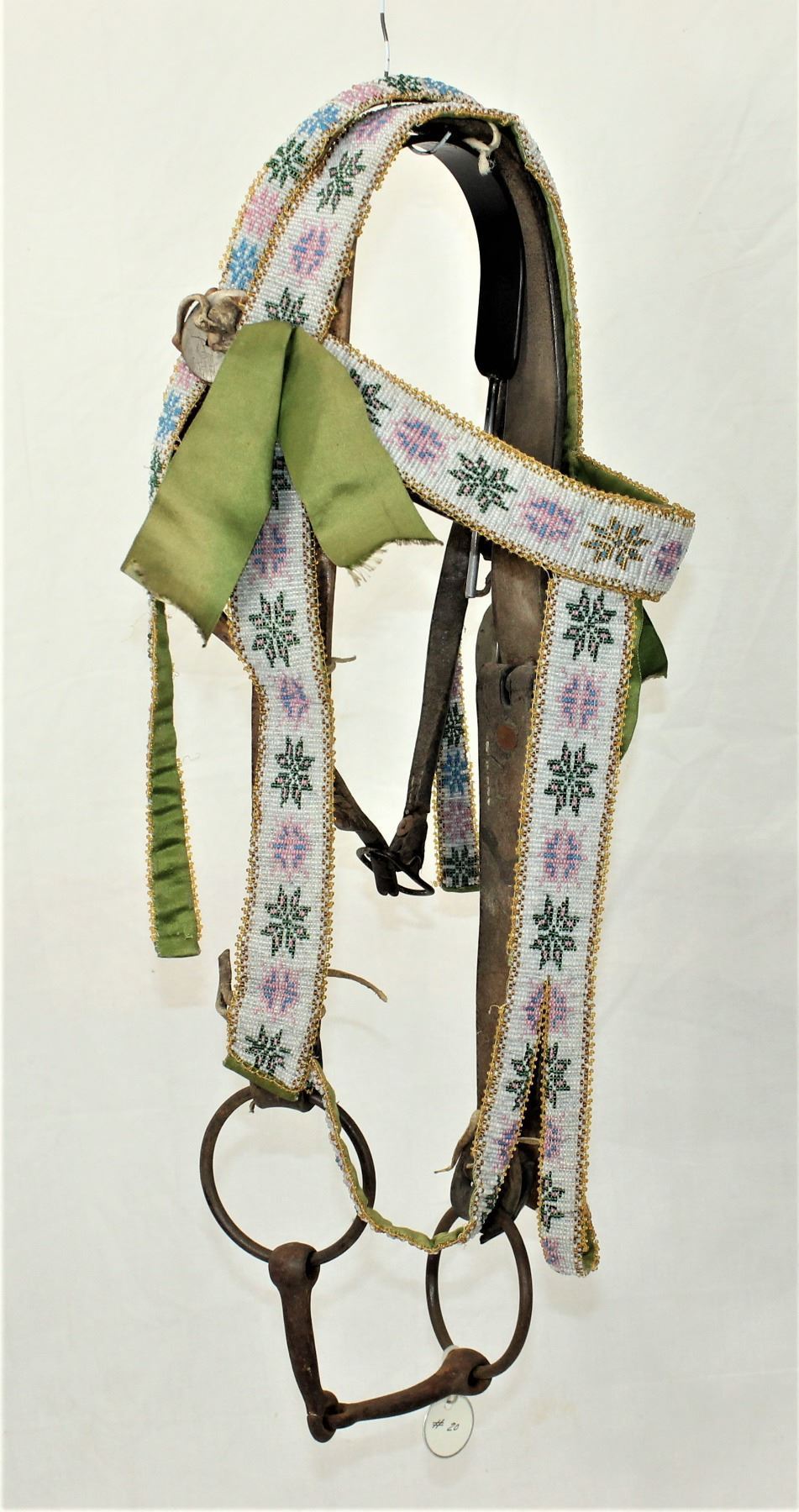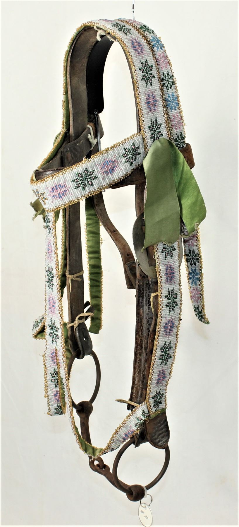 Intrguing large Northwest Native American 1920's headstall, fully beaded with floral patterns throughout, accented by decorative ribbons, and period iron snaffle bit.