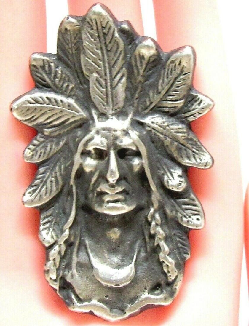 For your consideration is this absolutely spectacular Native American San Felipe tufa cast sterling silver Indian Chief ring in size 8. This statement ring features an intricately hand etched, detailed tufa cast chief design in sterling silver. Exceptional craftsmanship, superb attention to detail. Signed by the artist on the band, stamped sterling. Measures impressive 2.5" on the front. Outstanding example of Native American art to add to any jewelry collection! Statement piece!