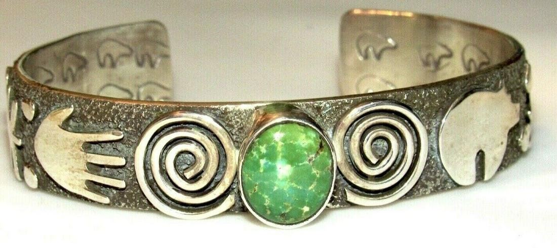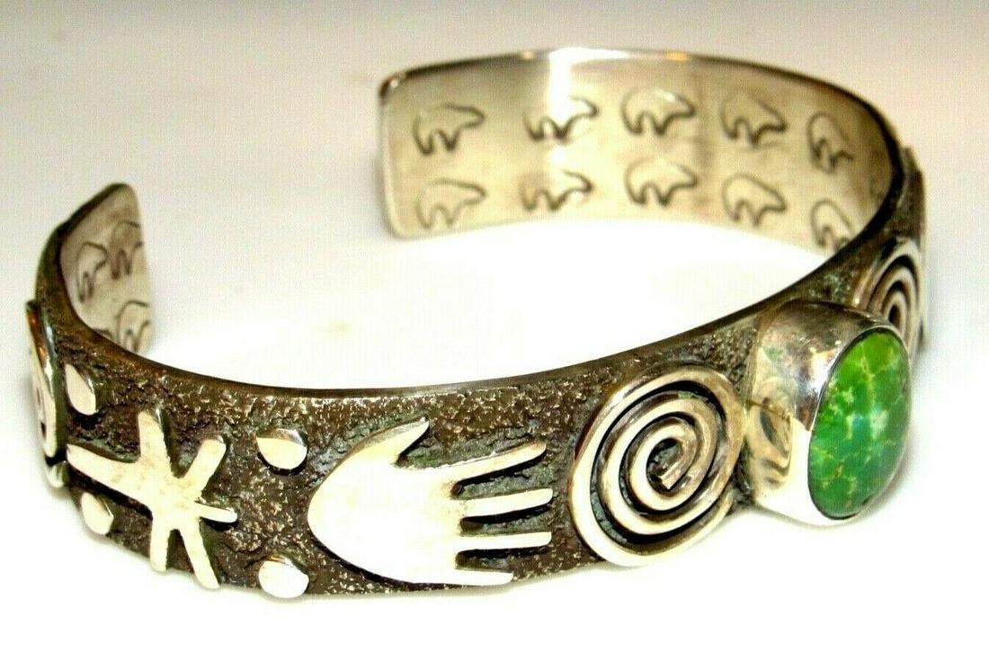 For your consideration is this phenomenal Navajo sterling silver and green Sonoral Gold turquoise petroglyph celestial design cuff bracelet by the highly collectible and renowned Navajo artist Alex Sanchez. This stunning beauty features an intricate, hand crafted celestial petroglyph design in sterling silver accented with powerful, tribal petroglyph symbols and a gorgeous green Sonoran gold mine turquoise cabochon. The bracelet measures about 1/2" wide and the inside circumference is about 7" including gap. The gap is about 1" and the cuff can be carefully adjusted. Weighs about 43 grams. Exceptional craftsmanship and attention to detail! Superb, unique pieced to add to any jewelry collection! Investment worthy, wearable Navajo art! Superb!
