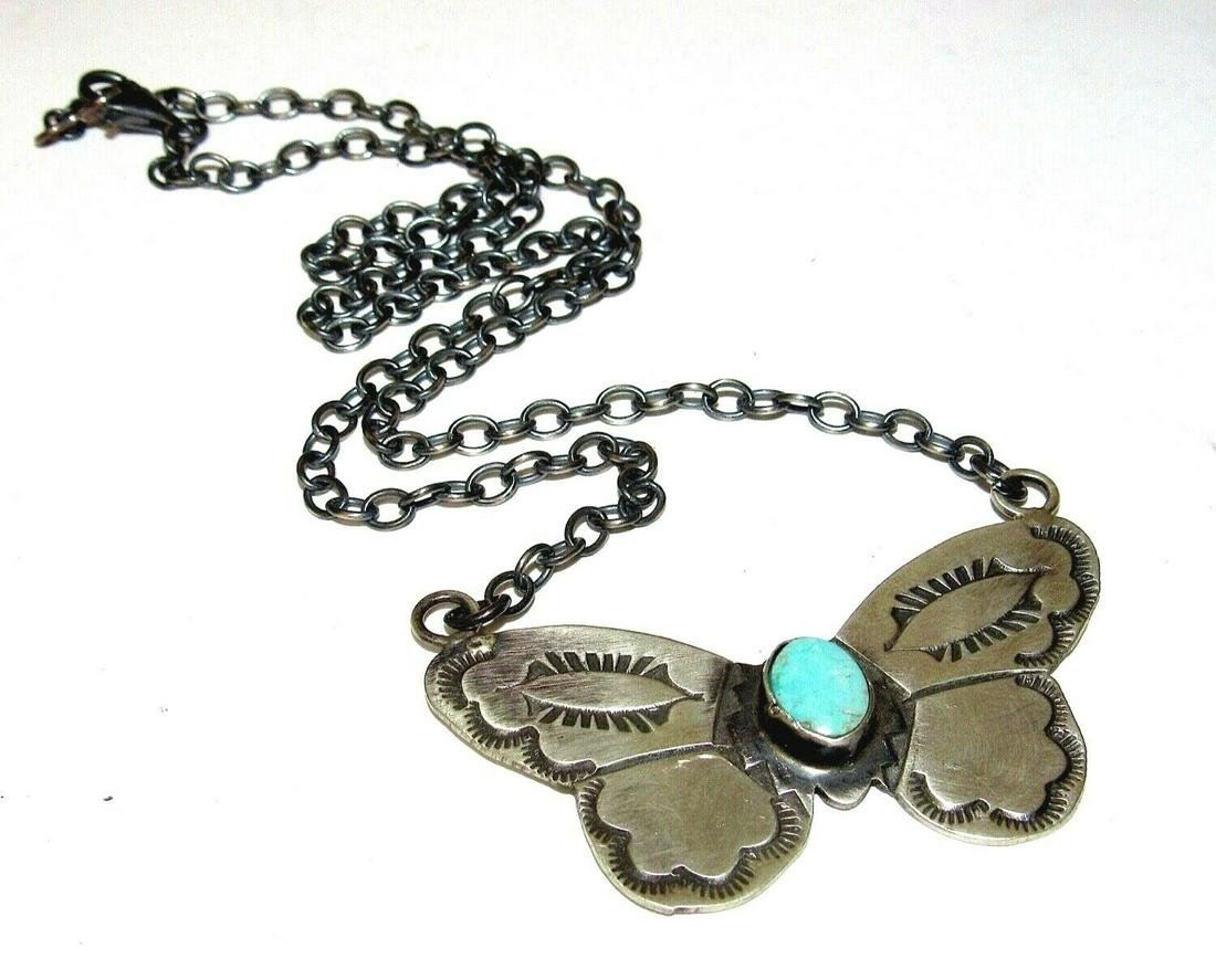 For your consideration is this stunning Navajo sterling silver and Kingman mine turquoise butterfly bar necklace. The necklace is about 18", length can be adjusted. The butterfly bar pendant measures about 2" wide by 1.5" tall. Signed and marked "sterling". Hallmarked. Gorgeous sterling butterfly pendant , oxidized sterling chain necklace. Signed, tested. Fab necklace.