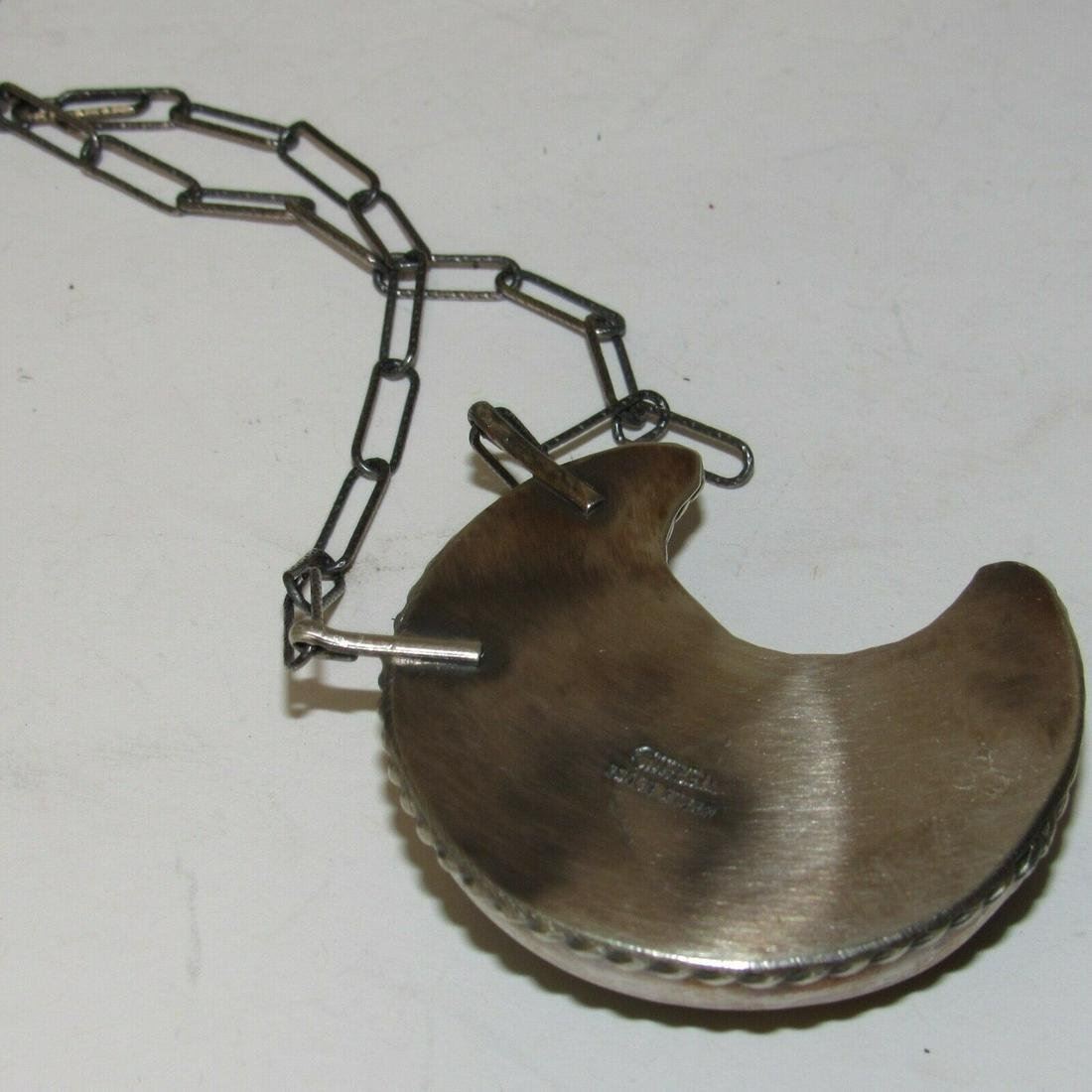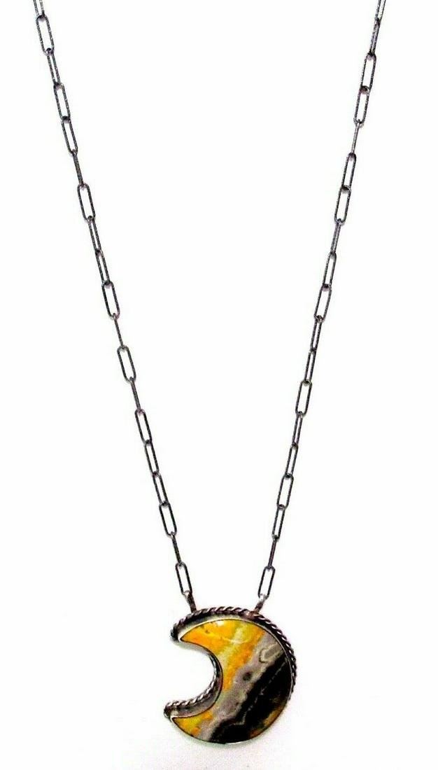 For your consideration is this phenomenal Navajo sterling silver and bumblebee jasper crescent moon bar necklace. The necklace is about 22" long and the length is adjustable from choker to full length. The necklace features a gorgeous crescent moon bar pendant and a nice sterling silver chain with oxidizes silver finish. The bumblebee jasper star pendant measures about 1 1/2" long by about 1" wide. Created by M. House and comes directly from the artist's collection. Gorgeous stone, sterling chain necklace. Fab Native statement necklace.