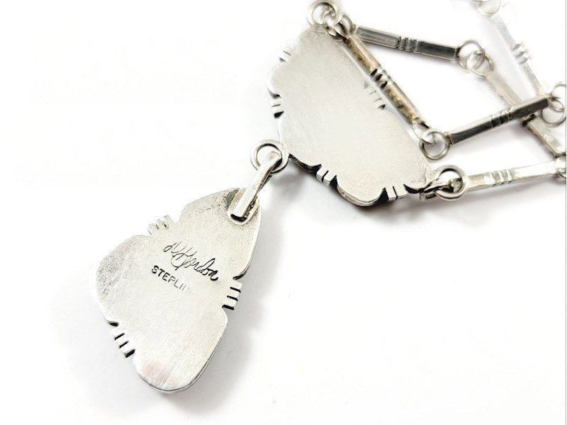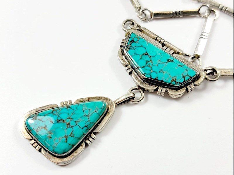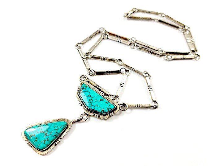 Fab Navajo sterling silver and turquoise dangle necklace by the collectible Derrick Gordon. The necklace is 21.5" long and weighs about 30Gr.