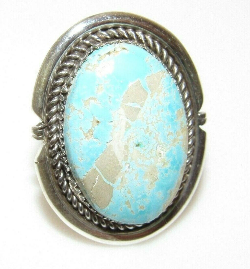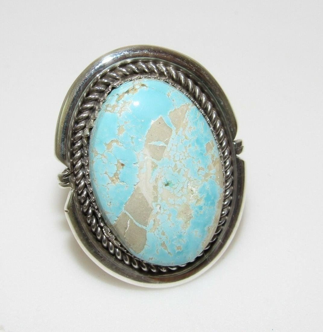 For your consideration is this fantastic Native American Navajo sterling silver and phenomenal, Dry Creek turquoise mine cabochon in size 7. This fabulous ring features a hand etched traditional design in sterling silver accented with a gorgeous light blue Dry Creek mine turquoise cabochon. Signed by the artist on the back. Size 7. The front of the ring measures about 1 1/2" tall on the front. Stunning example of wearable Native American art to add to any collection!