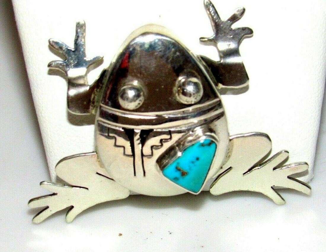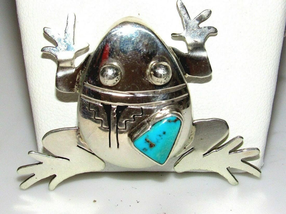 For your consideration is this wonderful and meaningful Native American Navajo sterling silver and Kingman turquoise intricately hand etched frog pendant by the highly collectible artist Benny Ration. The pendant features an intricately hand etched, detailed frog design in sterling silver and is accented with a beautiful Kingman turquoise cabochon. The pendant is marked "sterling" and is signed "Bennie Ration". Superb, one of a kind example of collectible Native American art to add to any jewelry collection! The pendant measures 2" wide by about 1.5" tall at. Fab statement piece!